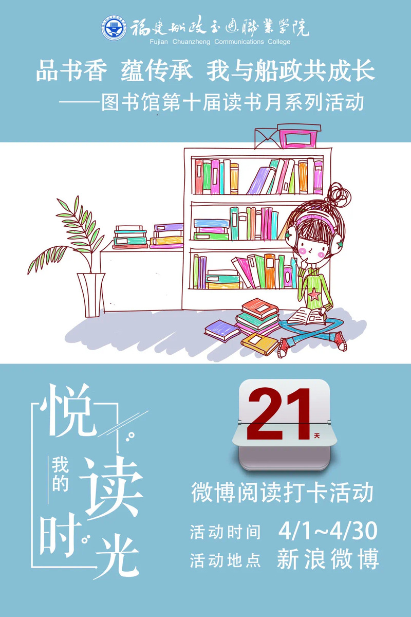 為了引導(dǎo)廣大師生養(yǎng)成多讀書(shū)、讀好書(shū)、好讀書(shū)的習(xí)慣,在第25個(gè)“世界讀書(shū)日”來(lái)臨之際,我院圖書(shū)館于2020年3月—4月開(kāi)展“品書(shū)香,蘊(yùn)船政,我與船政共成長(zhǎng)”圖書(shū)館第十屆讀書(shū)月系列活動(dòng),活動(dòng)包含豐富多彩、形式多樣的線上閱讀活動(dòng),同時(shí)我們也為大家準(zhǔn)備了各種精美的禮品。希望廣大師生及時(shí)關(guān)注我館的微博、微信公眾號(hào),歡迎大家的參與!