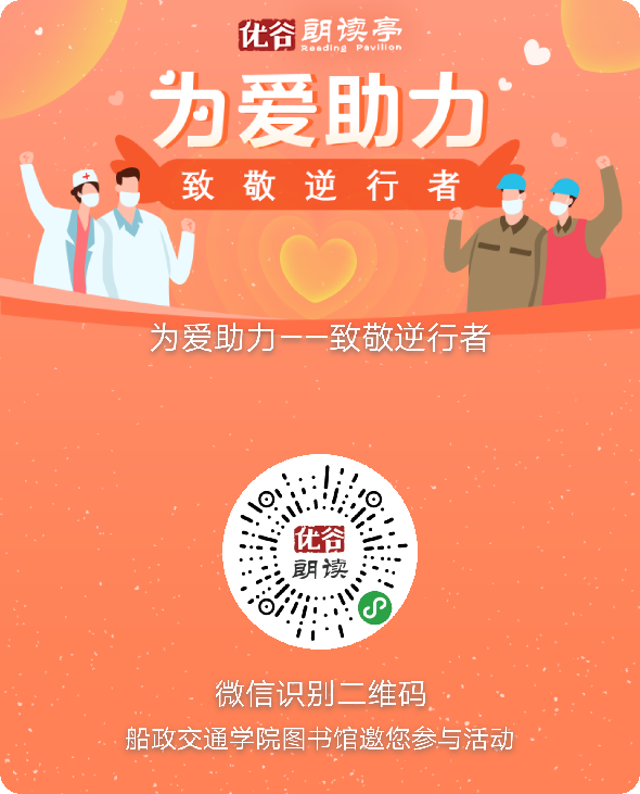 “品書香,蘊(yùn)傳承,我與船政共成長(zhǎng)”圖書館第十屆讀書月系列活動(dòng)火熱進(jìn)行中,圖書館與優(yōu)谷朗讀亭聯(lián)合發(fā)起 “為愛(ài)助力——致敬逆行者”行動(dòng),讓我們告白所有在這場(chǎng)"戰(zhàn)疫"中努力和奉獻(xiàn)的人們!