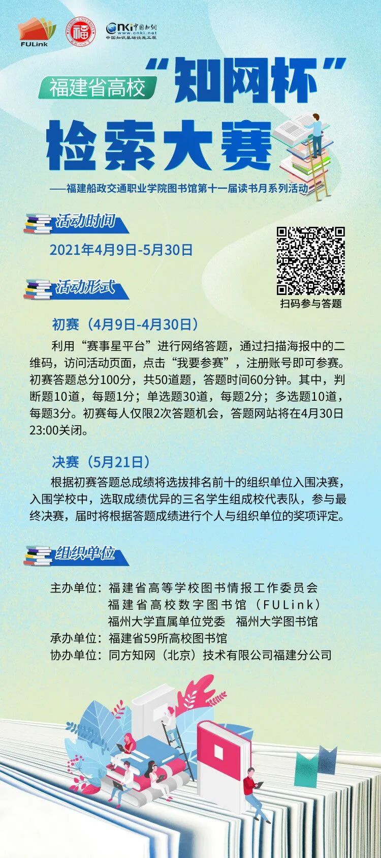 2021年是中國共產(chǎn)黨成立100周年,也是“十四五”開局之年,在第26個“世界讀書日”到來之際,福建省高等學(xué)校圖書情報工作委員會特舉辦“知網(wǎng)杯”檢索大賽,號召在校大學(xué)生學(xué)習(xí)黨史,養(yǎng)浩然正氣,努力踐行習(xí)近平總書記“修身慎行,懷德自重,敦方正直,清廉自守”的要求,希望以賽促學(xué),獻禮黨慶?,F(xiàn)將有關(guān)事項通知如下: