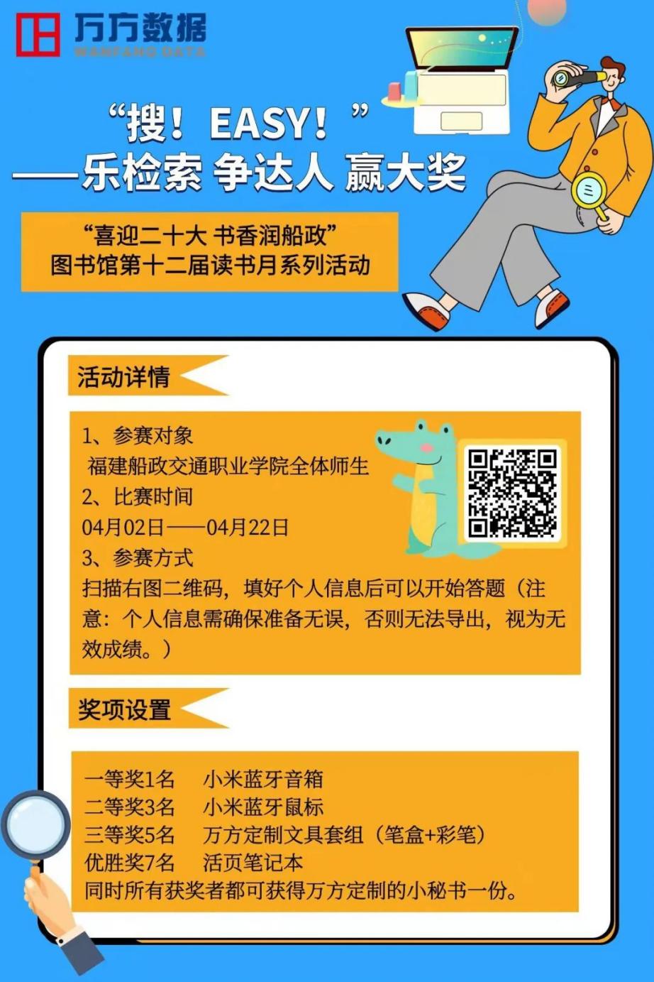 答題結(jié)束后,我們將根據(jù)每位參賽選手的最終成績評(píng)選出一等獎(jiǎng)1名、二等獎(jiǎng)3名、三等獎(jiǎng)5名及優(yōu)勝獎(jiǎng)7名。同時(shí)所有獲獎(jiǎng)?wù)叨伎梢垣@得萬方定制的小秘書一份。