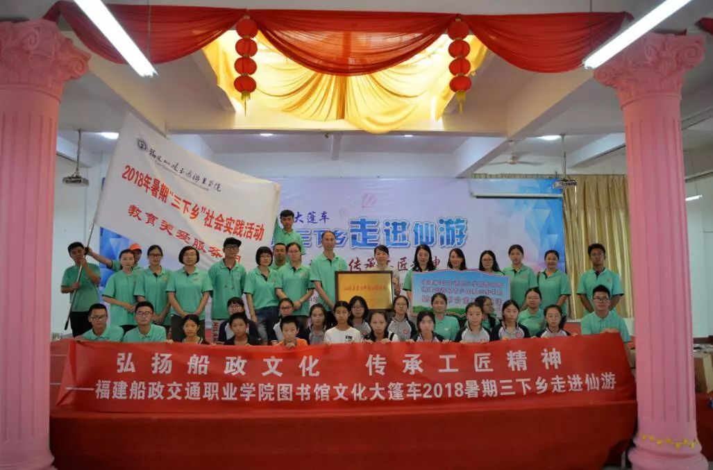 2018年我館依托圖書館“文化大篷車”項(xiàng)目,組成教育關(guān)愛服務(wù)團(tuán)“三下鄉(xiāng)”服務(wù)隊(duì),開展“弘揚(yáng)船政文化,傳承工匠精神”----圖書館文化大篷車2018暑期三下鄉(xiāng)走進(jìn)仙游活動(dòng)中開展豐富多彩的活動(dòng),取得喜人的成績(jī),獲得了共青團(tuán)福建省委授予的福建省大中專學(xué)生暑期“三下鄉(xiāng)”社會(huì)實(shí)踐活動(dòng)“先進(jìn)集體”的榮譽(yù)稱號(hào).