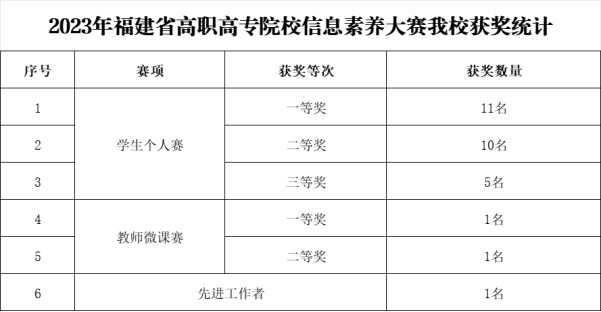 會(huì)議還為2023年福建省高職高專院校信息素養(yǎng)大賽獲獎(jiǎng)學(xué)生及優(yōu)秀指導(dǎo)老師、教師微課賽獲獎(jiǎng)教師、優(yōu)秀組織獎(jiǎng)、最佳組織獎(jiǎng)、先進(jìn)工作者進(jìn)行表彰。在此次福建省高職高專院校信息素養(yǎng)大賽中,我校一等獎(jiǎng)獲獎(jiǎng)數(shù)量和獲獎(jiǎng)總數(shù)均位列全省第一,并榮獲最佳組織獎(jiǎng)。