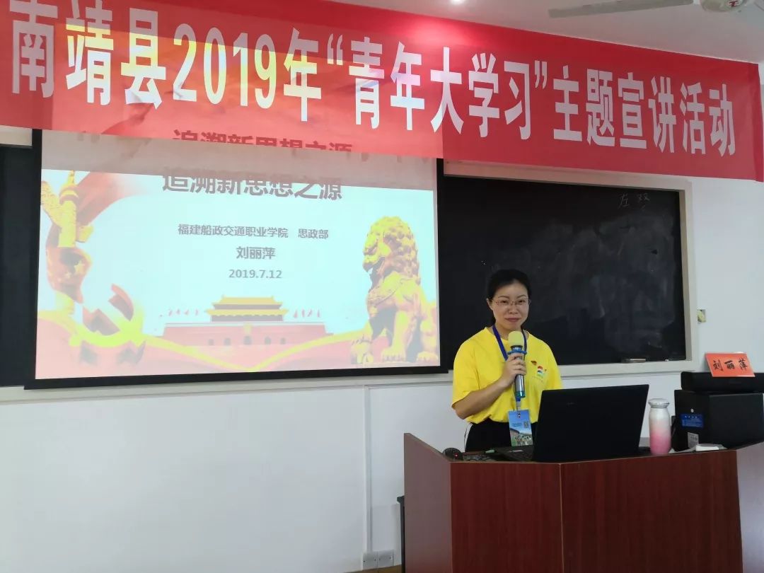 為進(jìn)一步宣傳“習(xí)近平新時(shí)代中國(guó)特色社會(huì)主義思想”,由福建船政交通職業(yè)學(xué)院圖書館特邀我院思政部教師組成的“習(xí)近平新時(shí)代中國(guó)特色社會(huì)主義思想宣講團(tuán)”來(lái)到南靖縣團(tuán)縣委,兒童公園青少年活動(dòng)中心,我院思政部劉麗萍老師向全縣青年團(tuán)干開展“追溯新思想之源”主題講座。