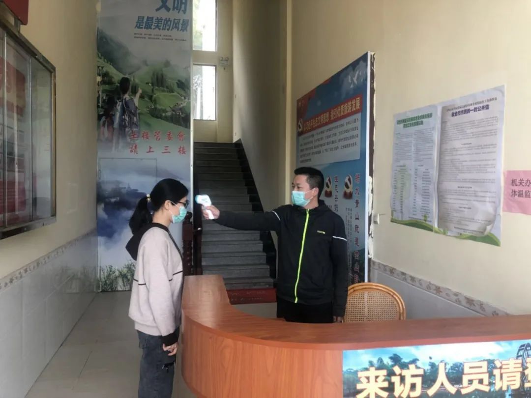 (圖為簡(jiǎn)源茂為居民測(cè)量體溫)