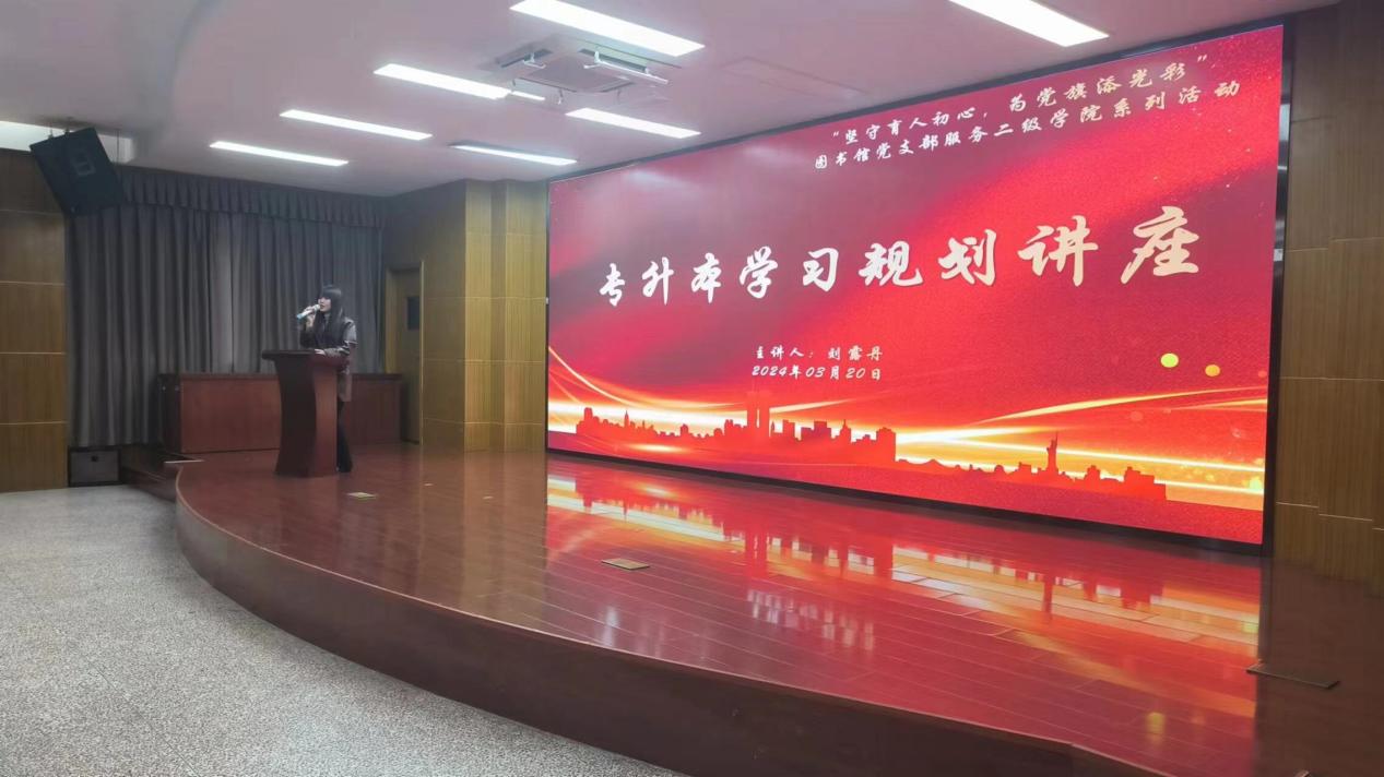 圖書館秉持全心全意為學生服務的理念,為幫助學生更好地了解專升本信息,做好未來學習規(guī)劃,3月20日,在福道園行政樓6樓學術報告廳,圖書館黨支部開展服務二級學院系列活動——舉辦“專升本學習規(guī)劃”專題講座。邀請專升本政策規(guī)劃師劉露丹老師為同學作專升本政策解讀與報考指導,近300名同學聆聽了講座。