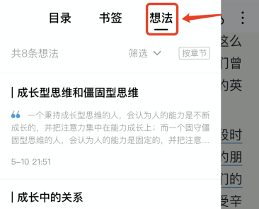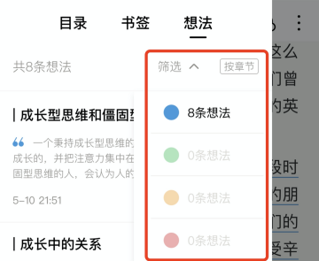 筆記定位:做了筆記想法需要時(shí)?;乜磸?fù)習(xí),輕點(diǎn)屏幕中央喚出功能區(qū),點(diǎn)擊左下角目錄,選擇【想法】可查看該本書所有筆記,同時(shí)可以根據(jù)顏色分類選擇想法。點(diǎn)擊想法內(nèi)容可直接跳轉(zhuǎn)到原文相應(yīng)位置。