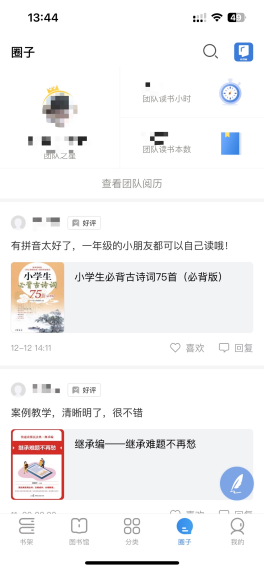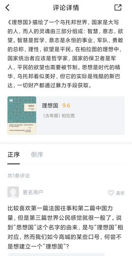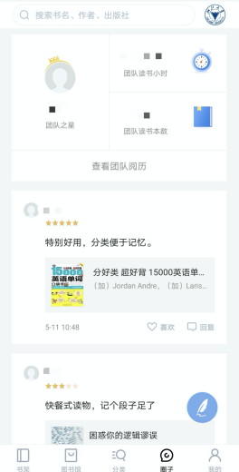 閱讀界面可以就一本書、一頁(yè)、或者一句話分別撰寫書評(píng)或想法與人交流。書評(píng)同步在本館圈子里,讀者可在圈子里就書評(píng)進(jìn)行討論回復(fù)、點(diǎn)贊等互動(dòng)。
