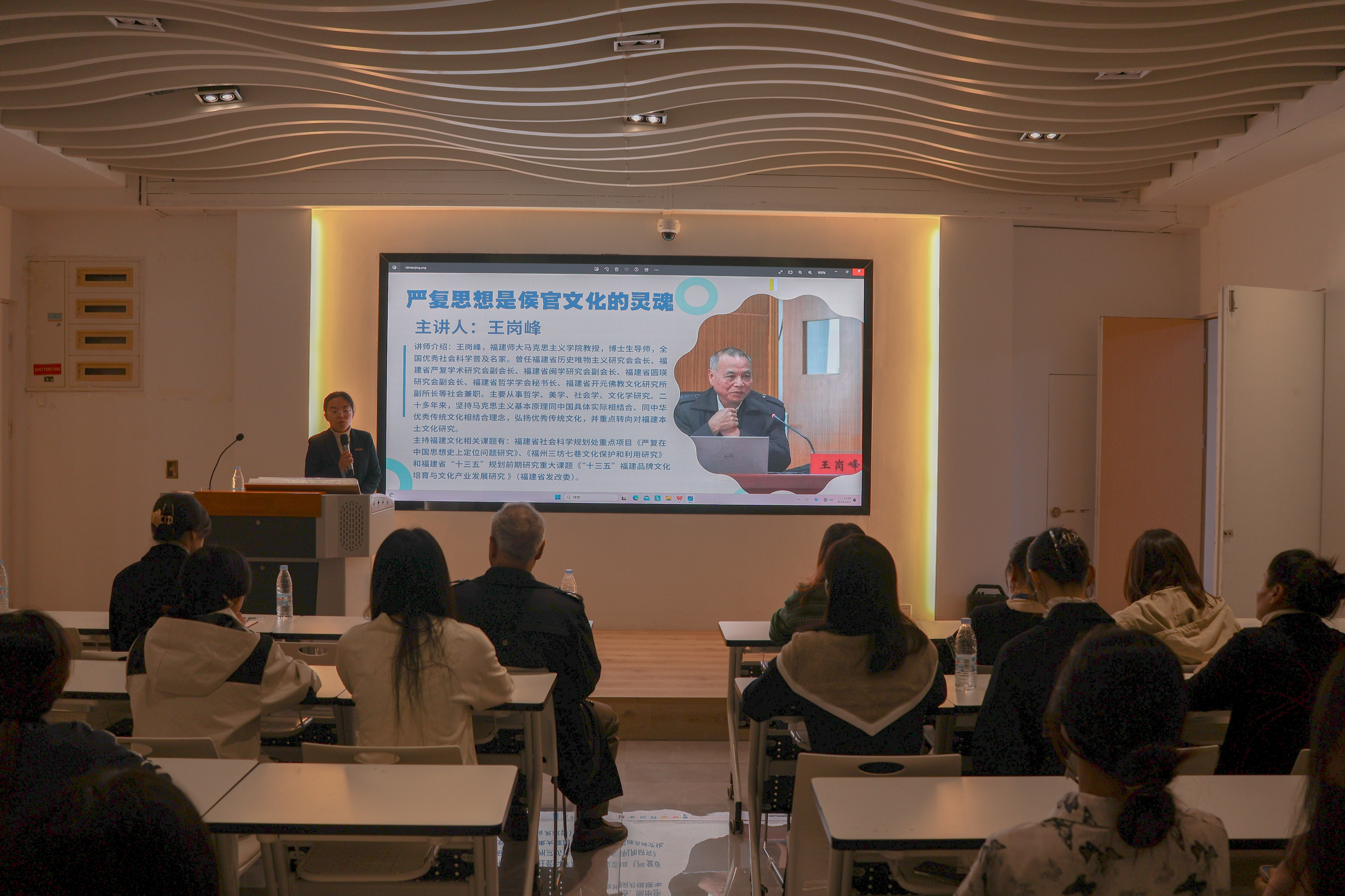 講座由福建師范大學馬克思主義學院博士生導師王崗峰教授主講。其內容圍繞著閩都文化、侯官文化、閩縣文化和福州文化概念的內涵和同異;嚴復為核心的福州學派——“侯官新學”;研究侯官文化的重要意義等方面展開。王教授詳細闡述了嚴復思想在侯官文化中的靈魂地位。