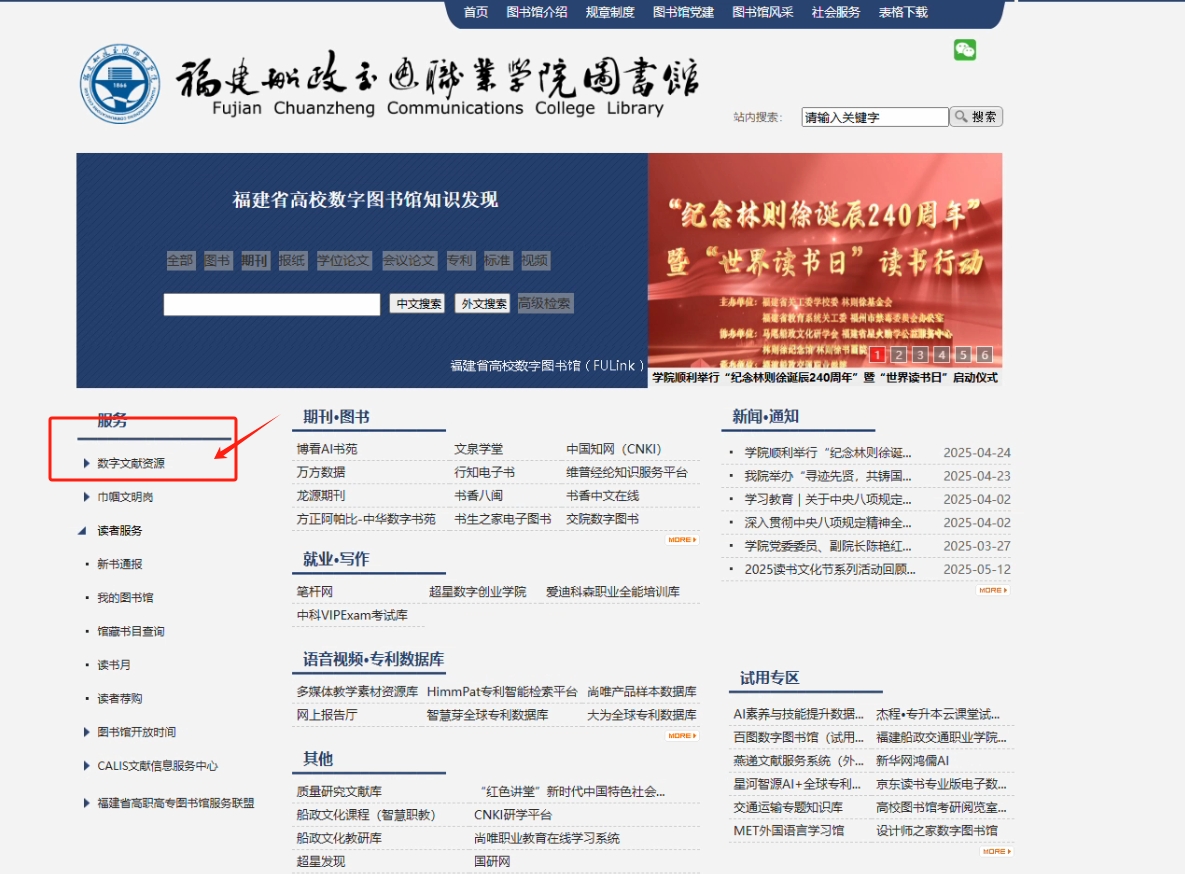 方法二:通過(guò)圖書館網(wǎng)站進(jìn)入數(shù)字文獻(xiàn)資源一站式訪問(wèn)平臺(tái)。