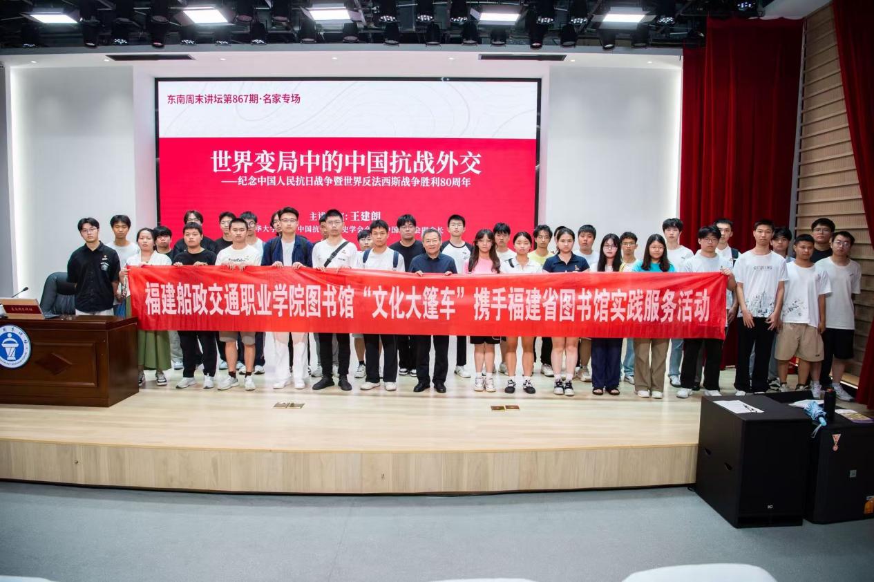 為深入學(xué)習(xí)貫徹黨的二十大精神,紀(jì)念中國人民抗日戰(zhàn)爭(zhēng)暨世界反法西斯戰(zhàn)爭(zhēng)勝利80周年,引導(dǎo)船政學(xué)子銘記歷史、緬懷先烈、珍愛和平,我校圖書館“文化大篷車”攜手省圖書館開展紀(jì)念中國人民抗日戰(zhàn)爭(zhēng)暨世界反法西斯戰(zhàn)爭(zhēng)勝利80周年社會(huì)實(shí)踐活動(dòng),激勵(lì)船政師生傳承紅色基因,勇?lián)鷷r(shí)代使命。