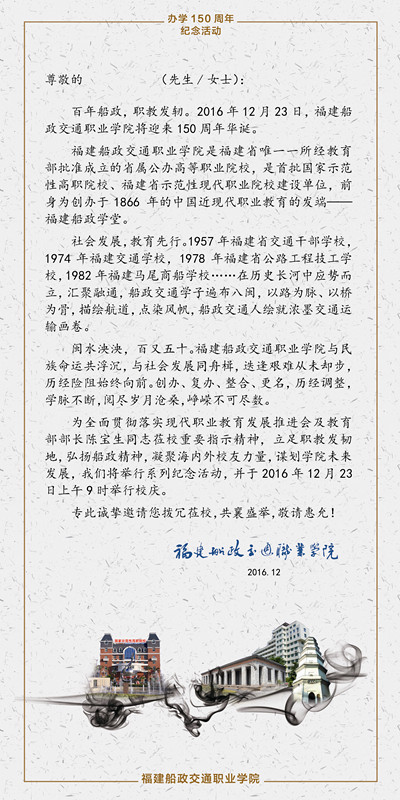 福建船政交通職業(yè)學(xué)院辦學(xué)150周年紀(jì)念活動(dòng)邀請(qǐng)函