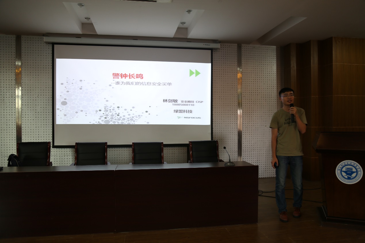 2018年6月25日下午,學(xué)院現(xiàn)代教育技術(shù)及網(wǎng)絡(luò)中心邀請(qǐng)北京神州綠盟科技有限公司安全顧問(wèn),中國(guó)信息安全測(cè)評(píng)中心注冊(cè)信息安全專(zhuān)業(yè)人員(CISP)林劍敏對(duì)我院在校生舉辦網(wǎng)絡(luò)安全知識(shí)講座,各系部總計(jì)約350名學(xué)生到場(chǎng)聽(tīng)取講座。