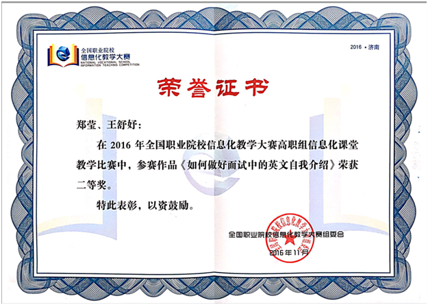 8 | 2017.01 | 2016年全國職業(yè)院校信息教學大賽 | 國家級 | Unit 8 Applying for a job | 二等獎 | 鄭瑩、王舒妤 | ||||||||