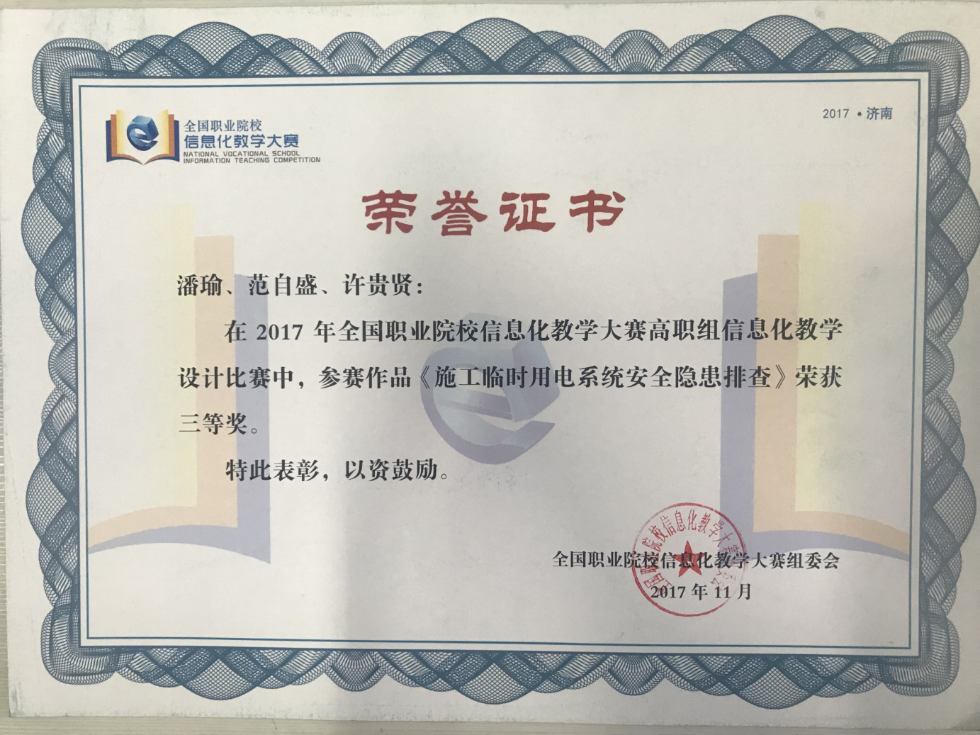 23 | 2018.01 | 2017年全國職業(yè)院校信息教學大賽 | 國家級 | 施工臨時用電系統(tǒng)安全隱患排查 | 三等獎 | 潘瑜、許貴賢、范自盛 | ||||||||