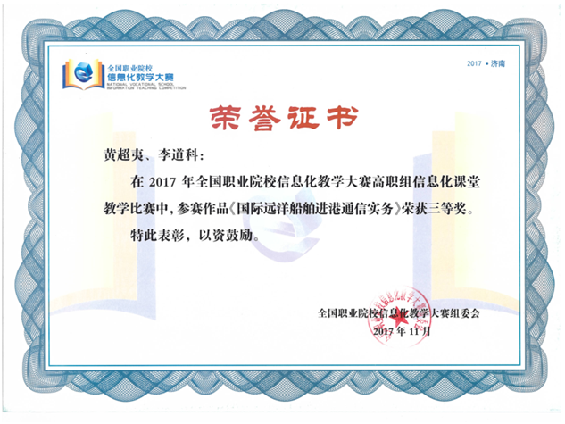 22 | 2018.01 | 2017年全國職業(yè)院校信息教學大賽 | 國家級 | 國際遠洋船舶進港通信實務 | 三等獎 | 黃超夷、李道科 | ||||||||