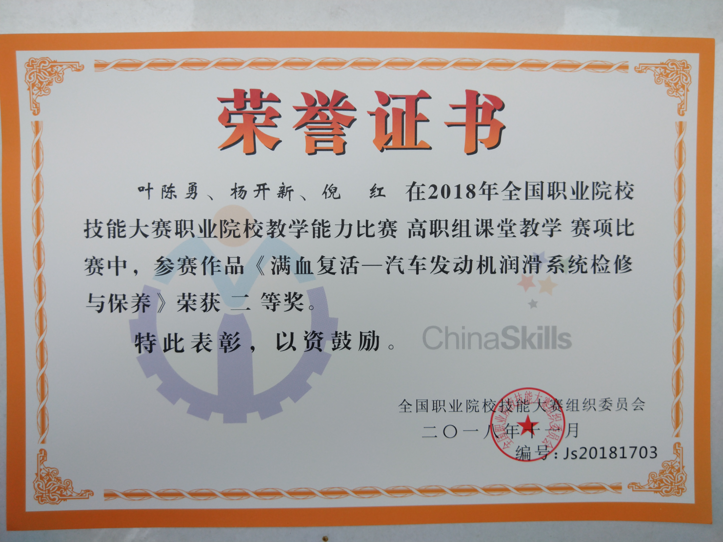 29 | 2018.08 | 2018年福建省職業(yè)院校信息化教學大賽 | 省級 | “滿血”復活—汽車發(fā)動機潤滑系統(tǒng)檢修 | 二等獎 | 葉陳勇、楊開新、倪紅 | ||||||||