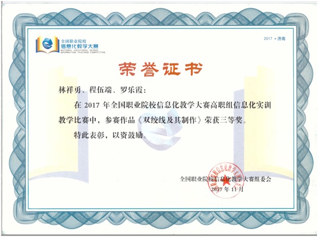 21 | 2018.01 | 2017年全國職業(yè)院校信息教學大賽 | 國家級 | 雙絞線及其制作 | 三等獎 | 林祥勇、程伍端、羅樂霞 | ||||||||