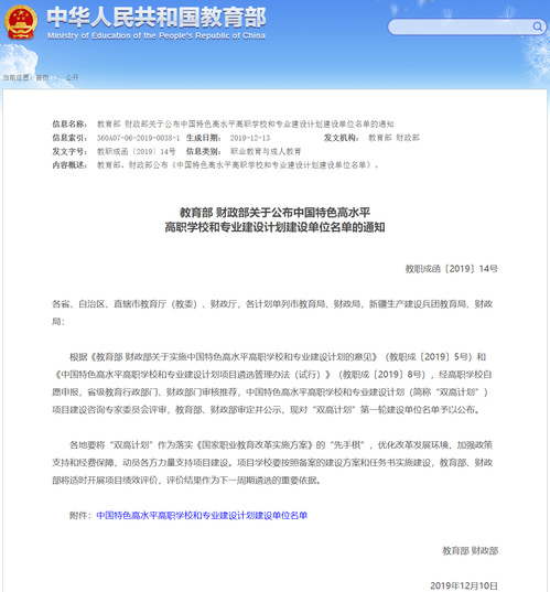 今年4月,教育部、財(cái)政部發(fā)布《關(guān)于實(shí)施中國(guó)特色高水平高職學(xué)校和專業(yè)建設(shè)計(jì)劃的意見(jiàn)》,提出將實(shí)施中國(guó)特色高水平高職學(xué)校和專業(yè)建設(shè)計(jì)劃(簡(jiǎn)稱“雙高計(jì)劃”),集中力量建設(shè)50所左右高水平高職學(xué)校和150個(gè)左右高水平專業(yè)群。
