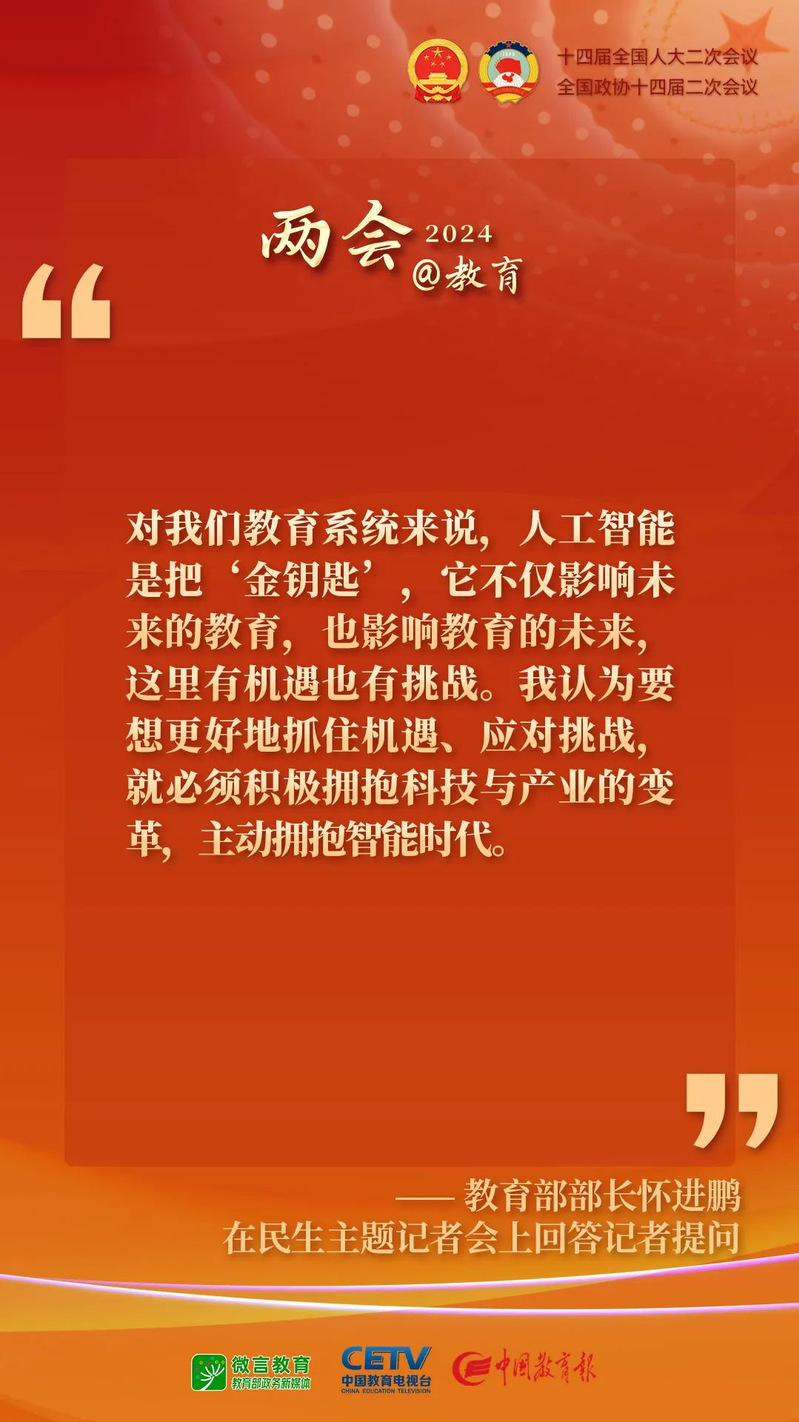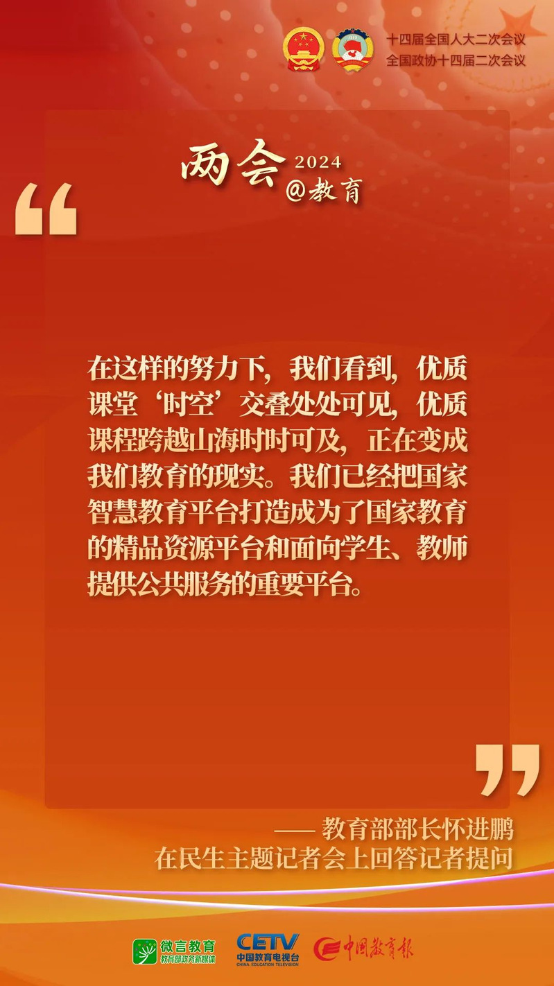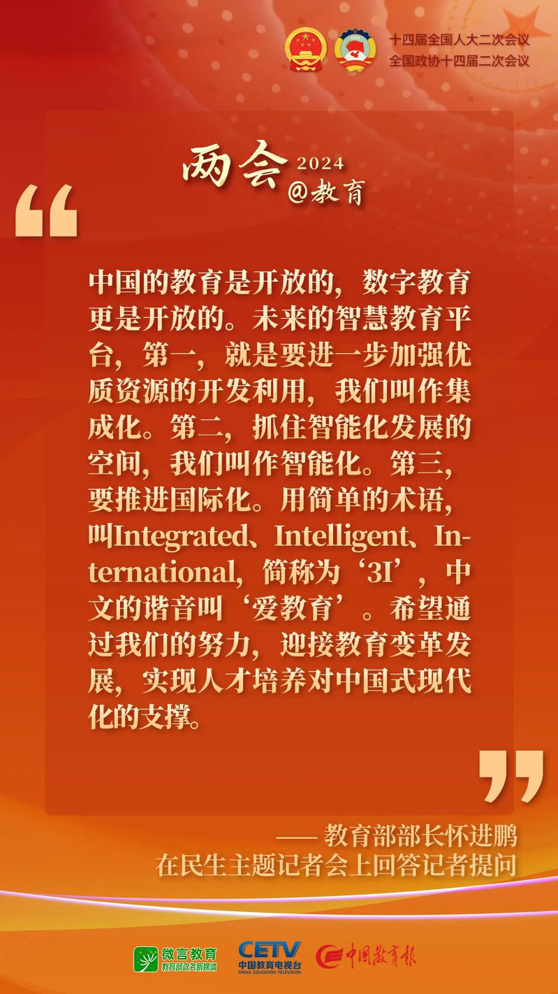 十四屆全國(guó)人大二次會(huì)議于3月9日下午舉行民生主題記者會(huì),教育部部長(zhǎng)懷進(jìn)鵬就教育相關(guān)問(wèn)題回答中外記者提問(wèn)。其中,關(guān)于數(shù)字教育,懷進(jìn)鵬部長(zhǎng)做了哪些回答?下一步數(shù)字教育將采取哪些重點(diǎn)的舉措?……一起來(lái)看現(xiàn)場(chǎng)答問(wèn)記錄