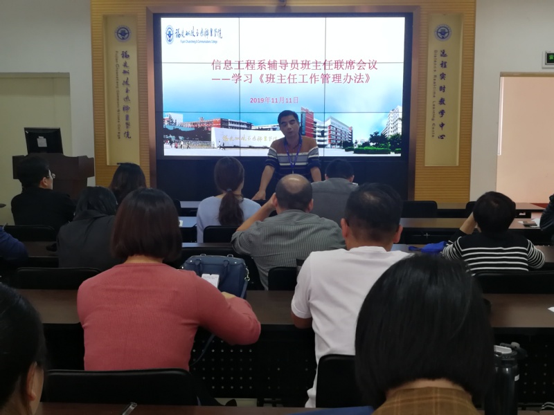 我系按照學(xué)院要求,于2019年11月11日中午12點(diǎn)30分,組織全體班主任在2號(hào)樓201室進(jìn)行學(xué)習(xí)。會(huì)議由信息工工程系黨總支孫基書記主持,在會(huì)上孫基書記帶領(lǐng)全體班主任認(rèn)真學(xué)習(xí)研讀了《福建船政交通職業(yè)學(xué)院班主任管理辦法》,他指出班主任是學(xué)校思想政治教育、學(xué)生管理工作的重要組成部分,是開(kāi)展大學(xué)生思想政治教育的骨干力量,是學(xué)生健康成長(zhǎng)成才的引路人,強(qiáng)調(diào)所有班主任要協(xié)同輔導(dǎo)員一起做好思想引領(lǐng)、學(xué)業(yè)指導(dǎo)、大學(xué)生涯輔導(dǎo)和職業(yè)規(guī)劃等工作。他強(qiáng)調(diào)做好班主任工作的關(guān)鍵在于要有教書育人的情懷、要有對(duì)學(xué)生的熱愛(ài)。會(huì)上,孫基書記還對(duì)班主任的近期工作重點(diǎn)提出要求: