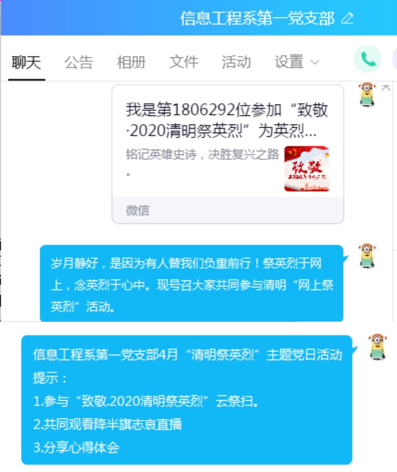 為深入學(xué)習(xí)貫徹習(xí)近平總書記關(guān)于疫情防控工作重要指示和英烈褒揚(yáng)工作重要論述精神,在清明節(jié)來臨之際,4月4日上午,信息工程系第一黨支部通過互聯(lián)網(wǎng)、qq平臺,組織師生黨員開展線上“清明祭英烈”主題黨日活動,積極營造緬懷先烈、崇尚英烈、學(xué)習(xí)英烈的濃厚氛圍。