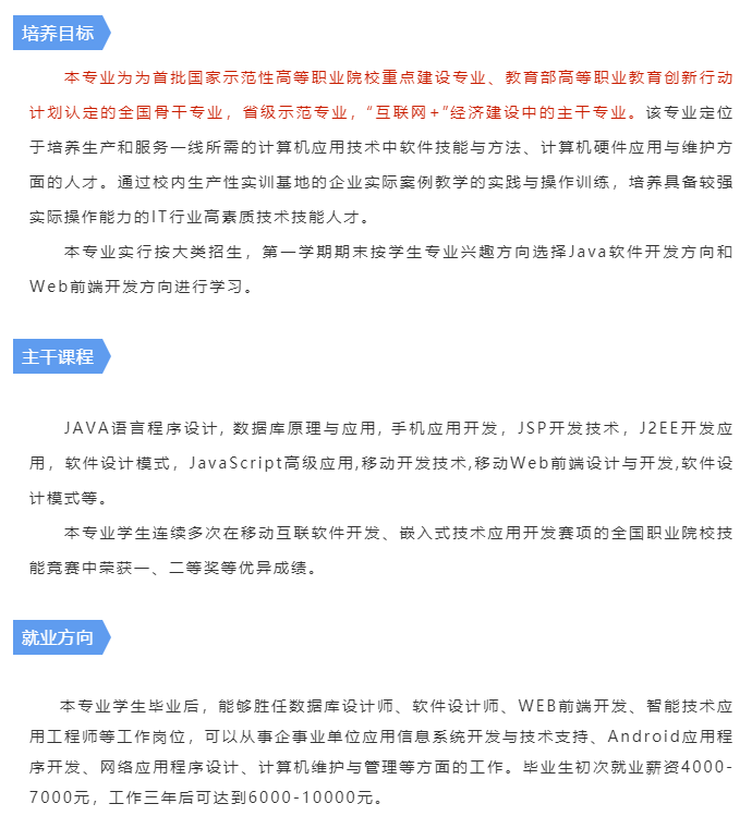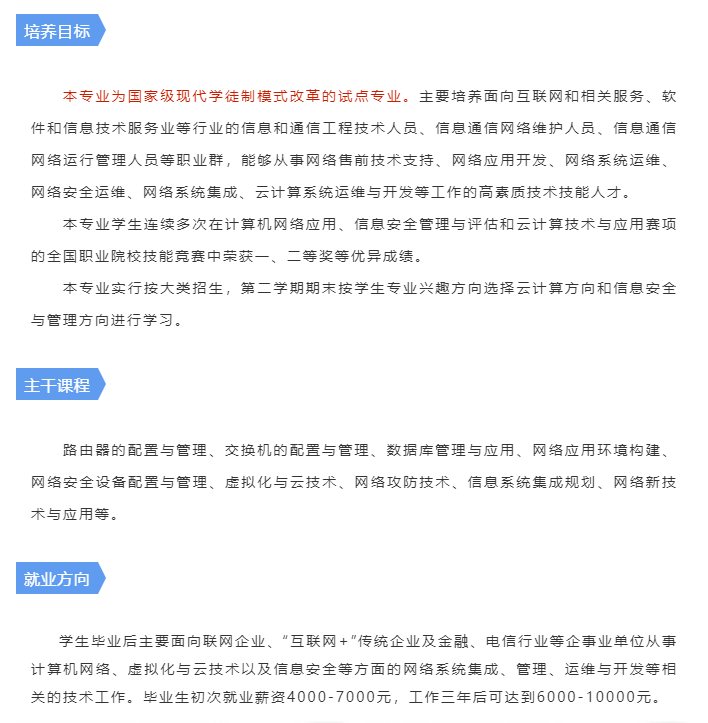 學(xué)院已與思科、星網(wǎng)銳捷、網(wǎng)龍等IT知名企業(yè)建立校企戰(zhàn)略合作,通過(guò)獲得國(guó)際職業(yè)技能證書(shū),提高學(xué)生的學(xué)習(xí)興趣,提升其專(zhuān)業(yè)技能和就業(yè)競(jìng)爭(zhēng)力。畢業(yè)生就業(yè)競(jìng)爭(zhēng)力、就業(yè)率、薪資水平和就業(yè)穩(wěn)定度均居省內(nèi)院校前列。