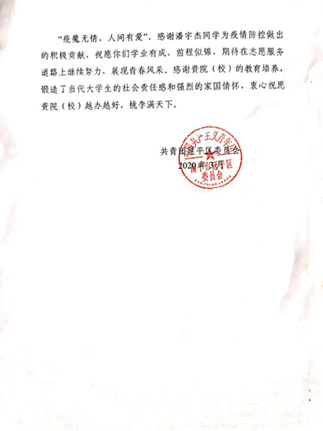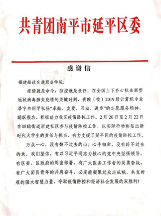 近期,信息工程系收到一封來自共青團(tuán)南平市延平區(qū)委的感謝信,來信主要是為了感謝我系19級軟件技術(shù)專業(yè)學(xué)生潘宇杰同學(xué)。疫情期間,潘宇杰同學(xué)積極報(bào)名參加社區(qū)防疫工作,有力支援了南平市延平區(qū)的疫情防控工作。信中共青團(tuán)延平區(qū)委高度表揚(yáng)了潘宇杰同學(xué)志愿參與疫情防控的無私奉獻(xiàn)精神,同時(shí)也表達(dá)了祝我院越辦越好,桃李滿天下的美好祝愿。
