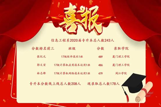 其中17級(jí)軟件技術(shù)1班張紀(jì)元同學(xué),專升本分?jǐn)?shù)489分被廈門理工學(xué)院錄取;17級(jí)計(jì)算機(jī)技術(shù)運(yùn)用1班郭文宏同學(xué),專升本分?jǐn)?shù)486分被廈門理工學(xué)院錄取;17級(jí)計(jì)算機(jī)網(wǎng)絡(luò)技術(shù)運(yùn)用1班林志鋒同學(xué),專升本分?jǐn)?shù)479分被閩江學(xué)院錄取。捷報(bào)傳來(lái),我院師生歡欣鼓舞!