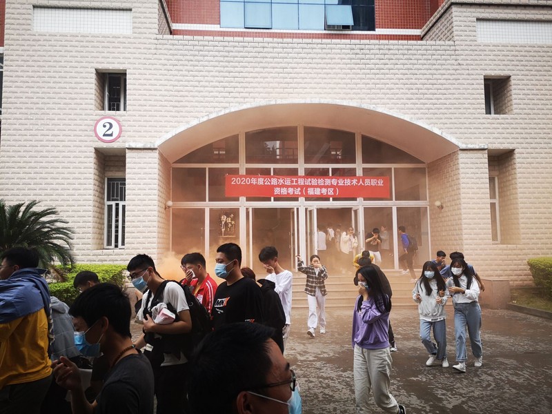 12時30分,逃生演練在北區(qū)學生宿舍6號樓及北區(qū)2號、8號教學樓拉開序幕,為真實模擬演習場景,工作人員在各樓前點燃煙霧彈,900多名師生由工作人員帶領(lǐng)彎腰,捂口掩鼻,沿著指定的逃生通道和樓梯口快速撤離到“安全地帶”北區(qū)籃球場。