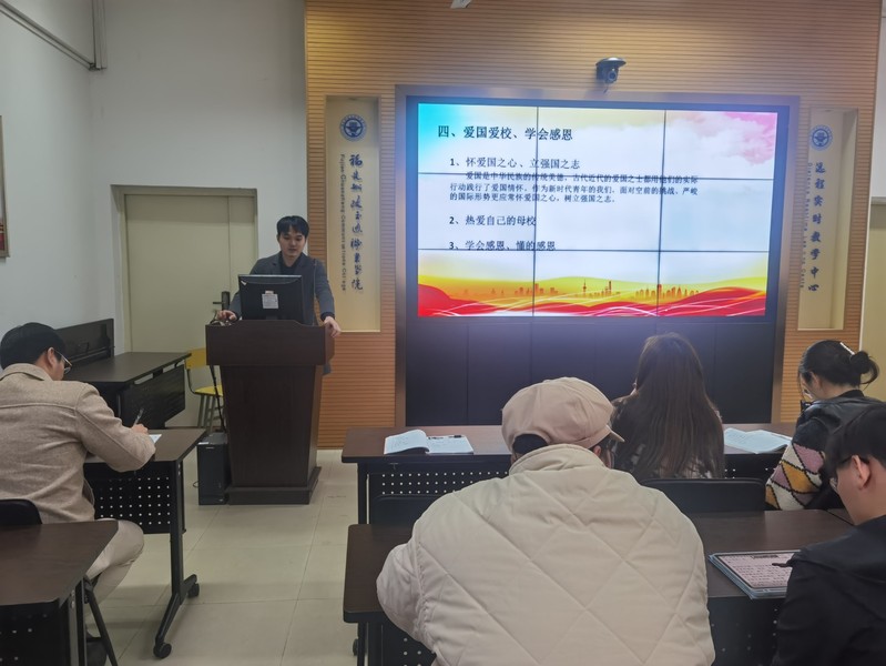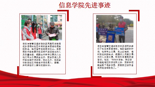 本次“開學(xué)第一課”還宣傳并表彰了我院學(xué)子在寒假期間積極參加抗疫志愿者的先進事跡。寒假期間,我院積極組織動員青年學(xué)生們在家鄉(xiāng)所在地就近就便開展個人寒假社會實踐活動,引導(dǎo)青年學(xué)生深入基層一線,在服務(wù)國家、服務(wù)社會中受教育、長本領(lǐng)、做貢獻。會上對他們的貢獻表示肯定,同時號召全院同學(xué)以他們?yōu)榘駱?,向他們學(xué)習(xí)。