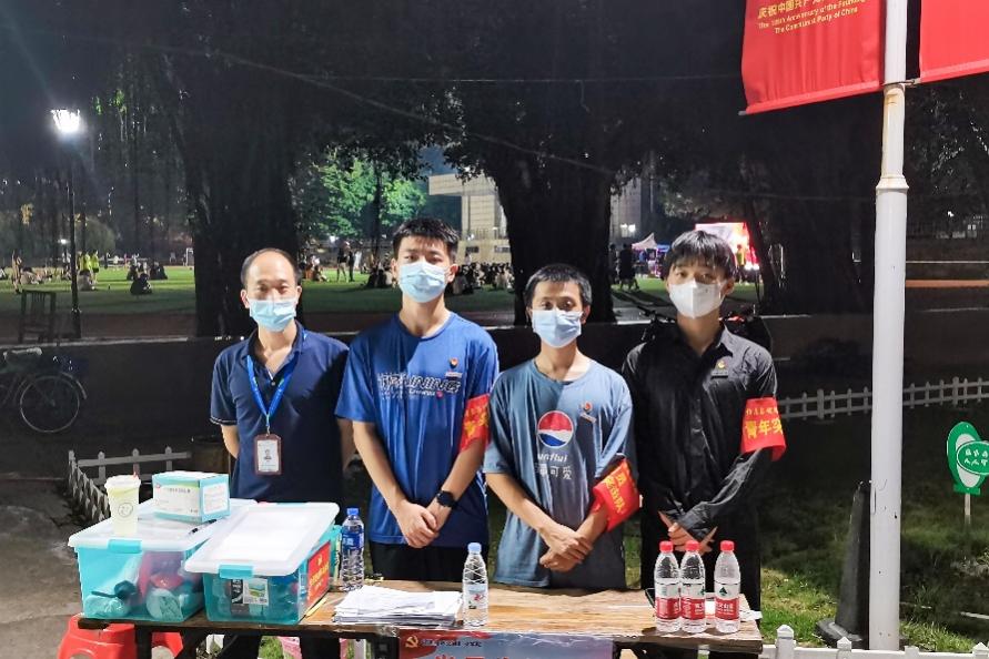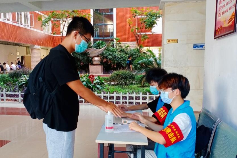 核酸檢測突擊隊主要負(fù)責(zé)在核酸檢測點配合醫(yī)護人員做好師生們的采樣工作。志愿者們在檢測點入口處為同學(xué)們測量體溫并引導(dǎo)師生有序排隊,保持安全距離,同時負(fù)責(zé)為同學(xué)們掃碼登記,在出口處提醒大家不要逗留做好檢測工作。