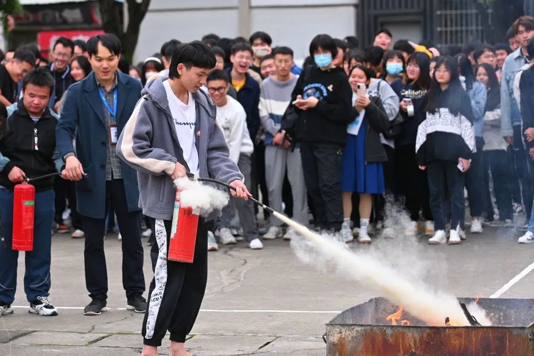 活動現(xiàn)場,鄭佳偉和張德華老師認真指導(dǎo)師生們?nèi)绾握_使用滅火器,并親自為信息學(xué)子演示滅火器的使用并邀請學(xué)生們上場實際操作。