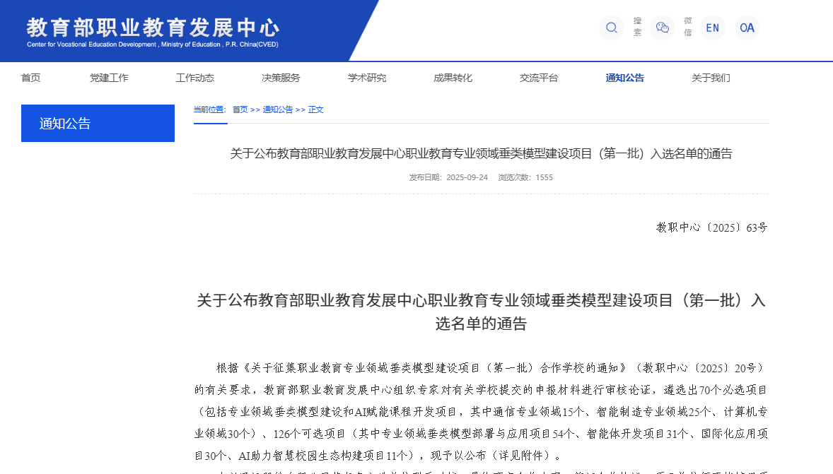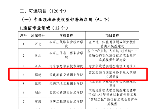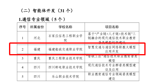 近日,教育部職業(yè)教育發(fā)展中心公布了“職業(yè)教育專業(yè)領域垂類模型建設項目(第一批)”入選名單,由信息與智慧交通學院團隊申報的“智慧交通與通信網絡職教大模型應用開發(fā)”項目成功入選,成為通信專業(yè)領域重點建設項目之一。