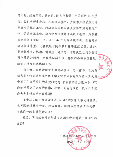 近日,由中航國際成套設(shè)備有限公司、肯尼亞教育部和中國教育國際交流協(xié)會聯(lián)合主辦的第十屆非洲職業(yè)技能挑戰(zhàn)賽(Africa Tech Challenge,簡稱“ATC”)圓滿落幕。我院信息與智慧交通學(xué)院師生團(tuán)隊全程護(hù)航移動應(yīng)用開發(fā)賽項,以專業(yè)師資精準(zhǔn)授課、青年志愿暖心服務(wù),圓滿完成了線上培訓(xùn)與技術(shù)保障任務(wù),并獲主辦單位中航國際成套設(shè)備有限公司專函致謝。