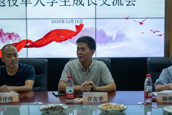 活動開始,學(xué)院黨總支書記許友孝率先發(fā)言,他向在場退役軍人學(xué)生致以崇高敬意,肯定其在軍旅生涯中錘煉的紀(jì)律意識、責(zé)任擔(dān)當(dāng)與堅(jiān)韌品格,強(qiáng)調(diào)這些品質(zhì)既是軍旅榮譽(yù),更是校園與未來發(fā)展的“精神財(cái)富”。隨后,學(xué)院黨總支副書記柳燕妮結(jié)合學(xué)院人才培養(yǎng)目標(biāo),聚焦退役軍人學(xué)生的校園適應(yīng)需求,鼓勵大家將部隊(duì)優(yōu)良作風(fēng)融入學(xué)習(xí)生活,主動調(diào)整身份轉(zhuǎn)變節(jié)奏,并明確學(xué)院將作為堅(jiān)實(shí)后盾,為其提供精準(zhǔn)支持、助力成長突破。