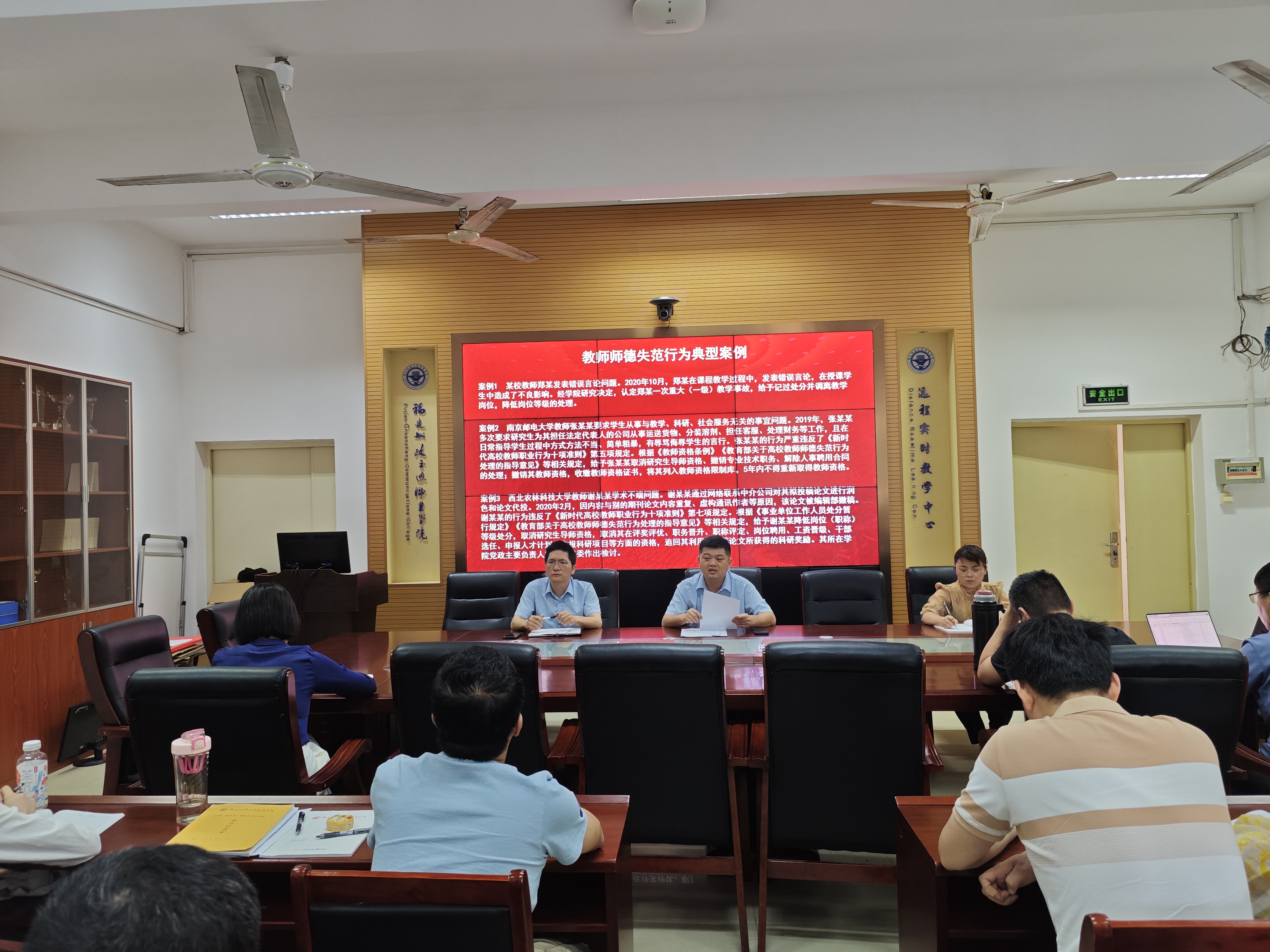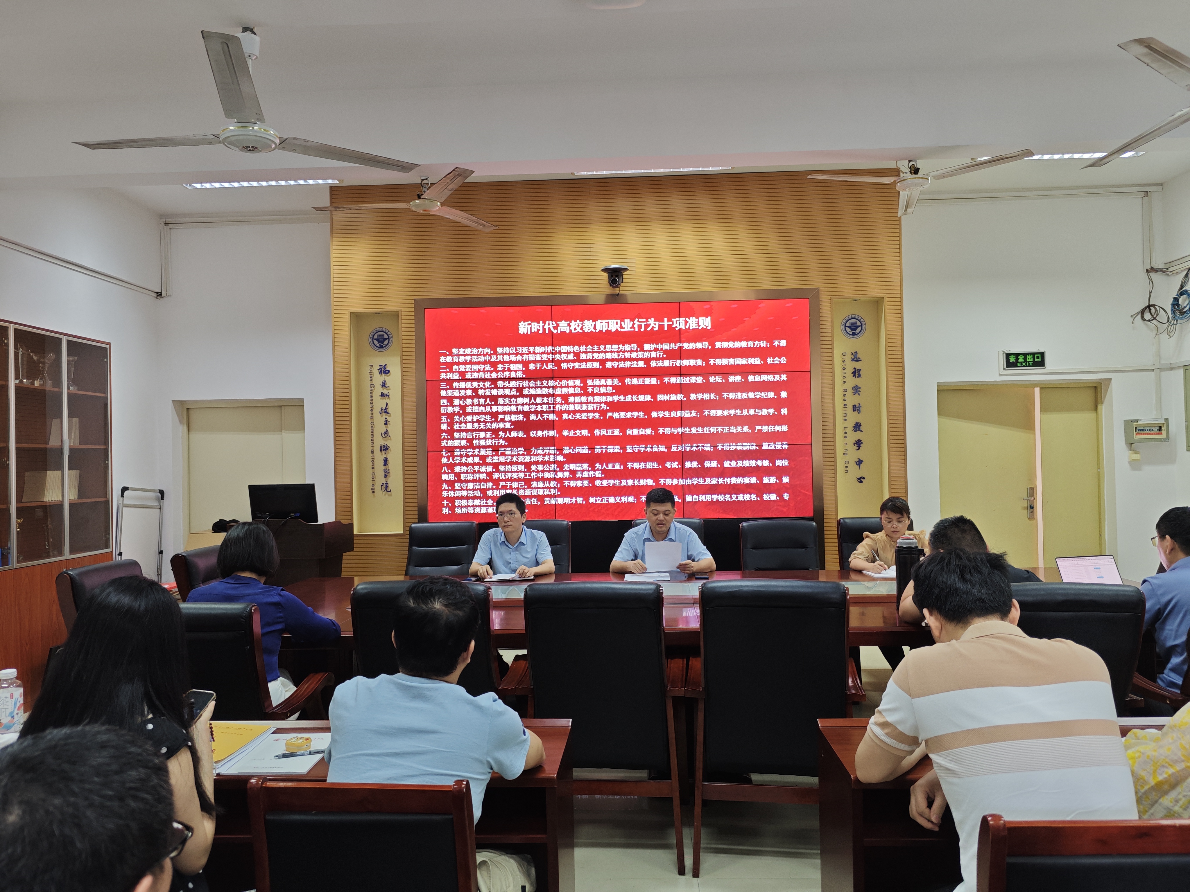 全體教職工集中學(xué)習(xí)《新時(shí)代高校教師職業(yè)行為十項(xiàng)準(zhǔn)則》,通過逐條解讀準(zhǔn)則內(nèi)涵,強(qiáng)化底線意識(shí)與責(zé)任擔(dān)當(dāng)。并結(jié)合師德失范行為典型案例展開深刻剖析,以真實(shí)案例為鏡鑒,警示教職工堅(jiān)守職業(yè)規(guī)范,杜絕學(xué)術(shù)不端、言行失當(dāng)?shù)葐栴}。會(huì)上林少丹指出,學(xué)院正在開展黨紀(jì)學(xué)習(xí)教育,要以黨紀(jì)學(xué)習(xí)教育引領(lǐng)師德師風(fēng)建設(shè),要把黨紀(jì)學(xué)習(xí)教育的內(nèi)容和要求體現(xiàn)到教師教學(xué)科研實(shí)際工作中去。全體教師要學(xué)習(xí)好、貫徹好、落實(shí)好習(xí)近平總書記關(guān)于教師隊(duì)伍建設(shè)的重要指示批示精神,時(shí)刻樹立“躬耕教壇,強(qiáng)國(guó)有我”的志向和抱負(fù),恪守教師職業(yè)行為準(zhǔn)則,潛心教書育人。謹(jǐn)記“四有好老師”“四個(gè)引路人”“四個(gè)相統(tǒng)一”標(biāo)準(zhǔn),積極發(fā)揮表率作用,以實(shí)際行動(dòng)共同營(yíng)造風(fēng)清氣正的育人環(huán)境。
