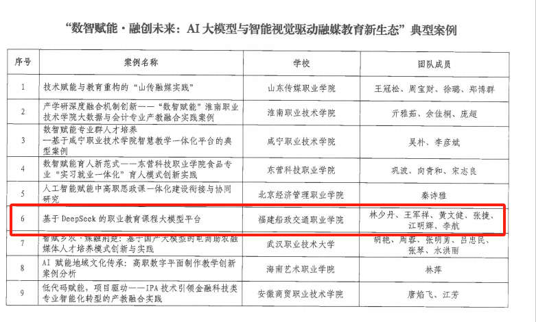 近日,我院申報的“基于DeepSeek的職業(yè)教育課程大模型平臺”案例,經(jīng)中國職業(yè)技術(shù)教育學(xué)會組織評審,入選“2025年數(shù)智賦能·融創(chuàng)未來:AI大模型與智能視覺驅(qū)動融媒教育新生態(tài)”典型案例。