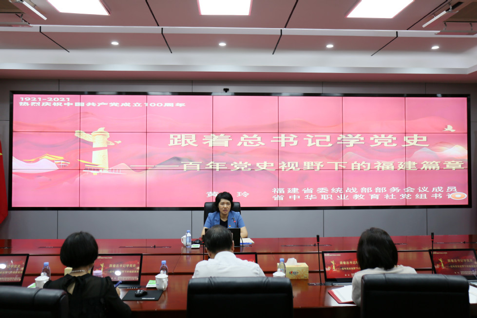 為推動(dòng)黨史學(xué)習(xí)教育走深走實(shí),教育引導(dǎo)全校師生牢固樹立學(xué)“四史”、葆初心、擔(dān)使命的思想自覺、行動(dòng)自覺,做到學(xué)史明理、學(xué)史增信、學(xué)史崇德、學(xué)史力行,學(xué)院邀請(qǐng)到福建省委統(tǒng)戰(zhàn)部部務(wù)會(huì)議成員、省中華職教社的黃玲書記于6月2日下午蒞校作《跟著總書記學(xué)黨史——百年黨史視野下的福建篇章》講座。學(xué)院黨委副書記陳宜大主持講座,中層干部、學(xué)生代表參加。
