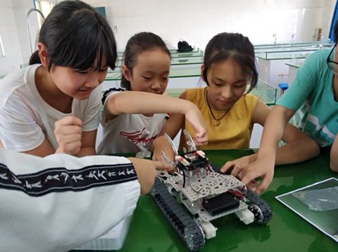 孩子們在志愿者們的教導(dǎo)下親手操縱機器人并與在問答環(huán)節(jié)積極互動