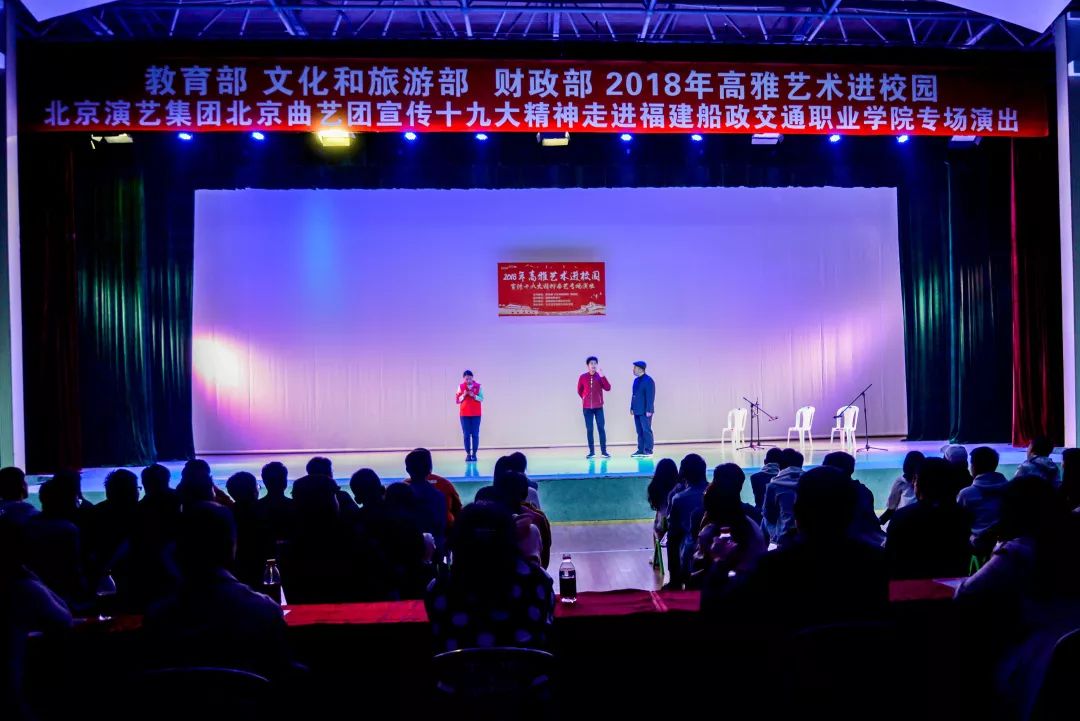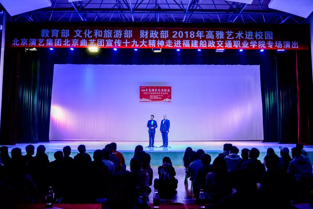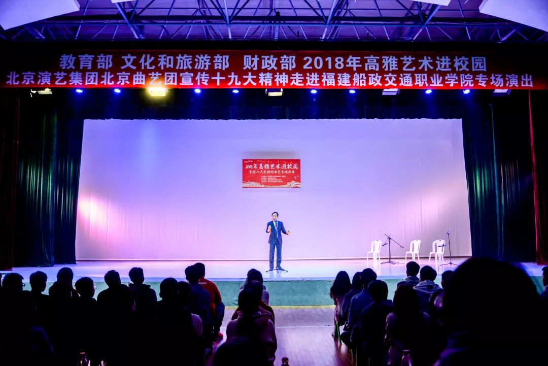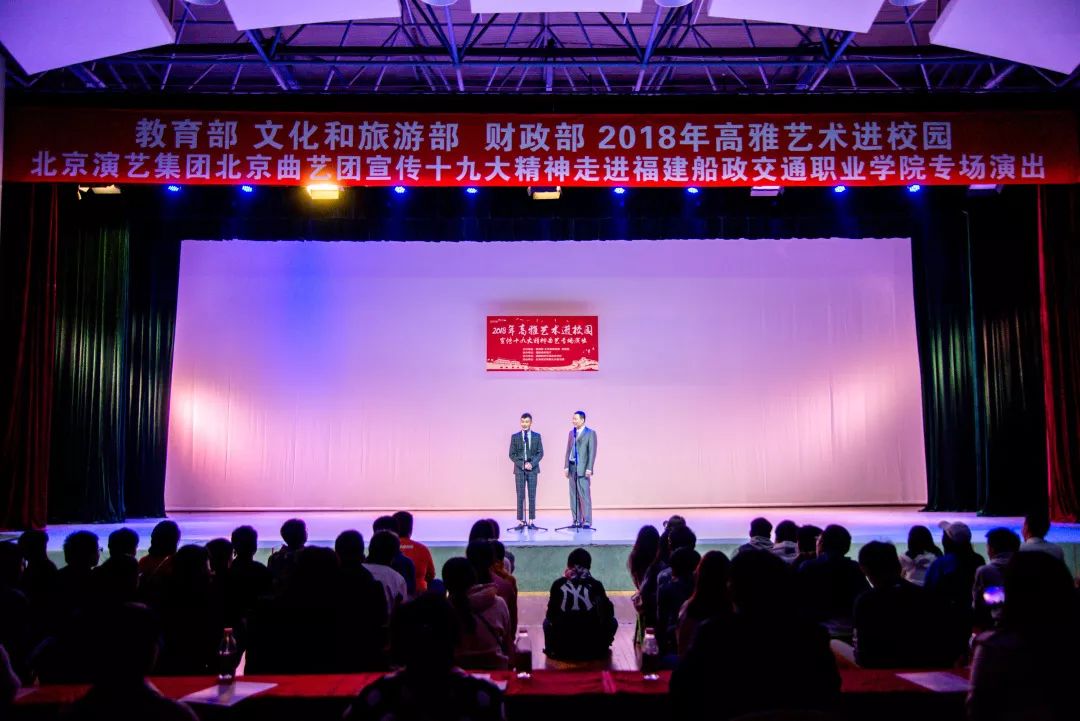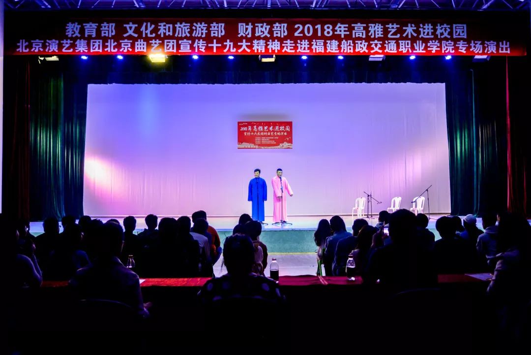 為深入學(xué)習(xí)貫徹黨的十九大精神,積極主動投身習(xí)近平新時代中國特色社會主義思想“大學(xué)習(xí)”熱潮中,11月22日,由教育部、文化旅游部和財政部三部委聯(lián)合舉辦,福建船政交通職業(yè)學(xué)院承辦的“高雅藝術(shù)進(jìn)校園——北京演藝集團(tuán)北京曲藝園走進(jìn)船政校園專場”在我校文體活動中心舉行。