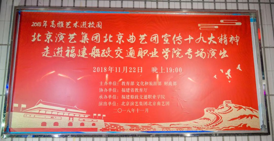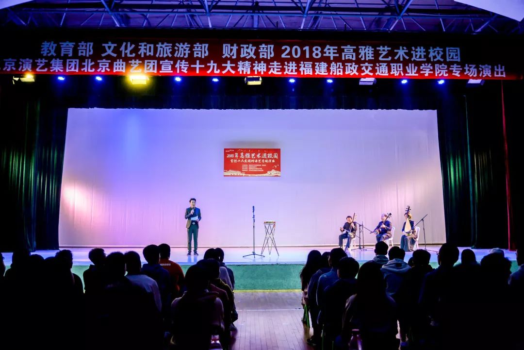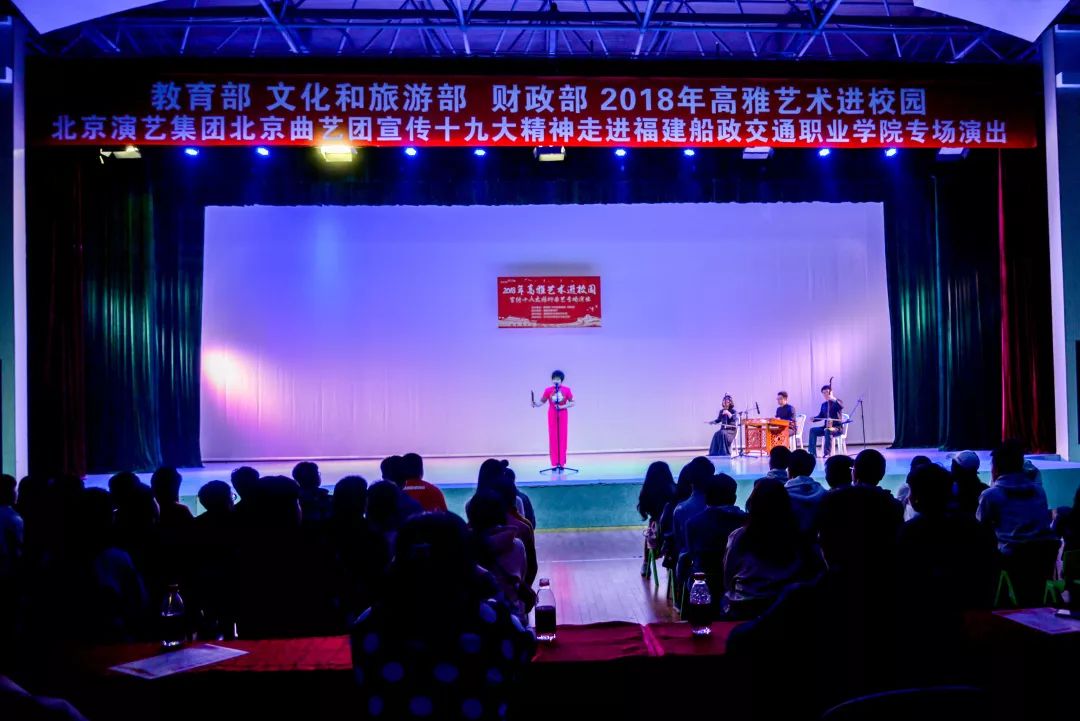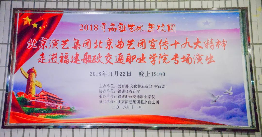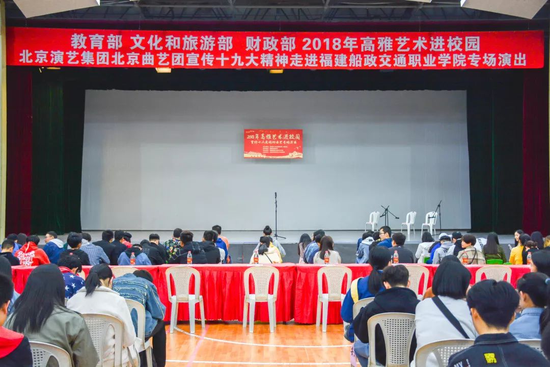 為深入學(xué)習(xí)貫徹黨的十九大精神,積極主動投身習(xí)近平新時代中國特色社會主義思想“大學(xué)習(xí)”熱潮中,11月22日,由教育部、文化旅游部和財政部三部委聯(lián)合舉辦,福建船政交通職業(yè)學(xué)院承辦的“高雅藝術(shù)進(jìn)校園——北京演藝集團(tuán)北京曲藝園走進(jìn)船政校園專場”在我校文體活動中心舉行。