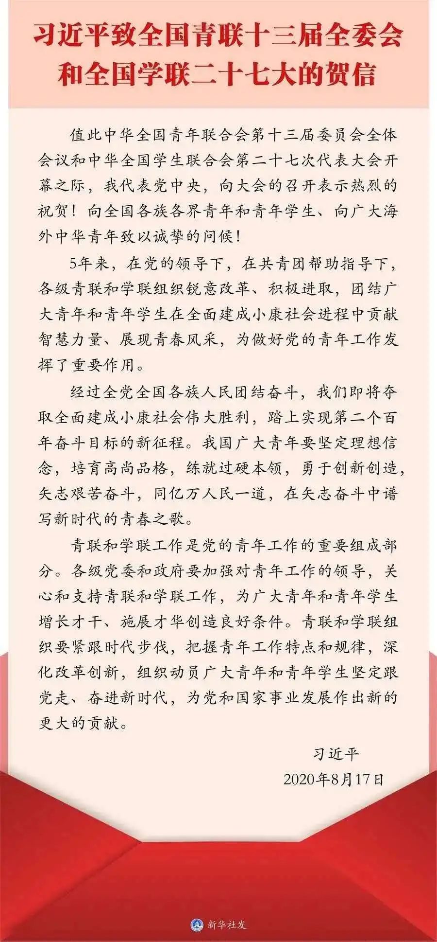 中華全國學(xué)生聯(lián)合會(huì)第二十七次代表大會(huì)在2020年8月17日上午在北京開幕。中共中央總書記、國家主席習(xí)近平發(fā)來賀信,代表黨中央,向大會(huì)的召開表示熱烈的祝賀,向全國各界青年和青年學(xué)生、向廣大海外中華青年致以誠摯的問候。