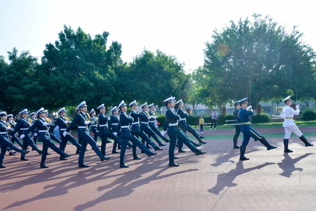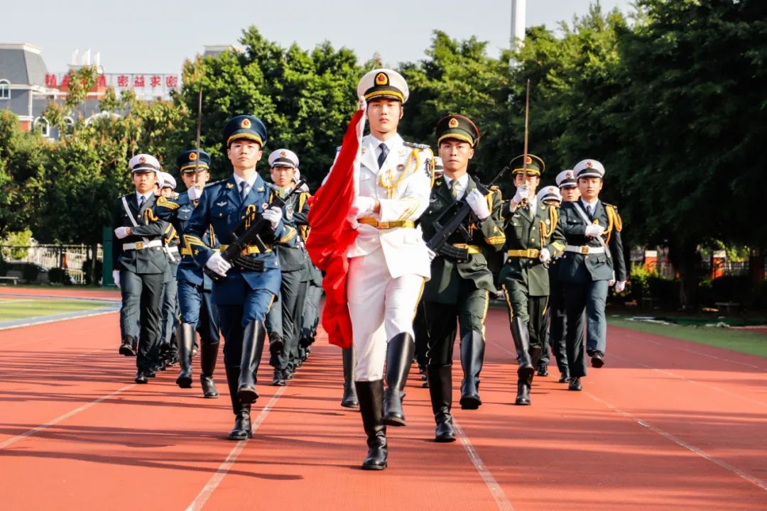 上午8:00,國旗護(hù)衛(wèi)隊(duì)員英姿颯爽,步伐鏗鏘,護(hù)送國旗莊嚴(yán)地走向升旗臺(tái)。