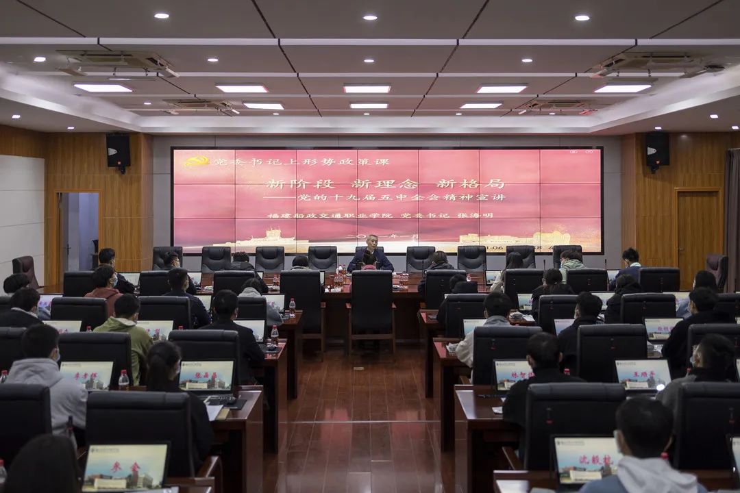 張海明書記以《新階段 新理念 新格局》為題,圍繞黨的十九屆五中全會的核心要義,決勝全面建成小康社會取得的決定性成就,構建新發(fā)展格局的戰(zhàn)略構想和重要著力點,以及與學校師生密切相關的建設教育強國、文化強國、人才強國、體育強國、健康中國,辦好人民滿意的教育,培養(yǎng)德技并修一專多能新時代船政人的美好向往等方面對十九屆五中全會精神進行了系統(tǒng)講解和生動闡釋。