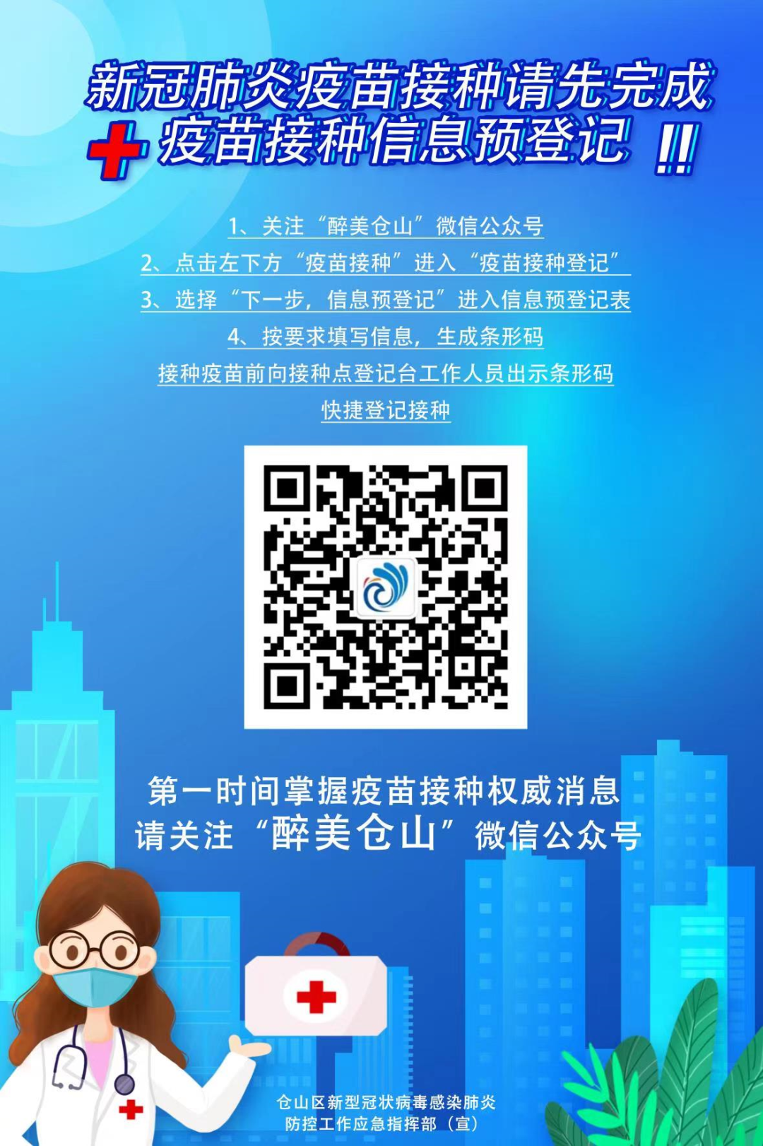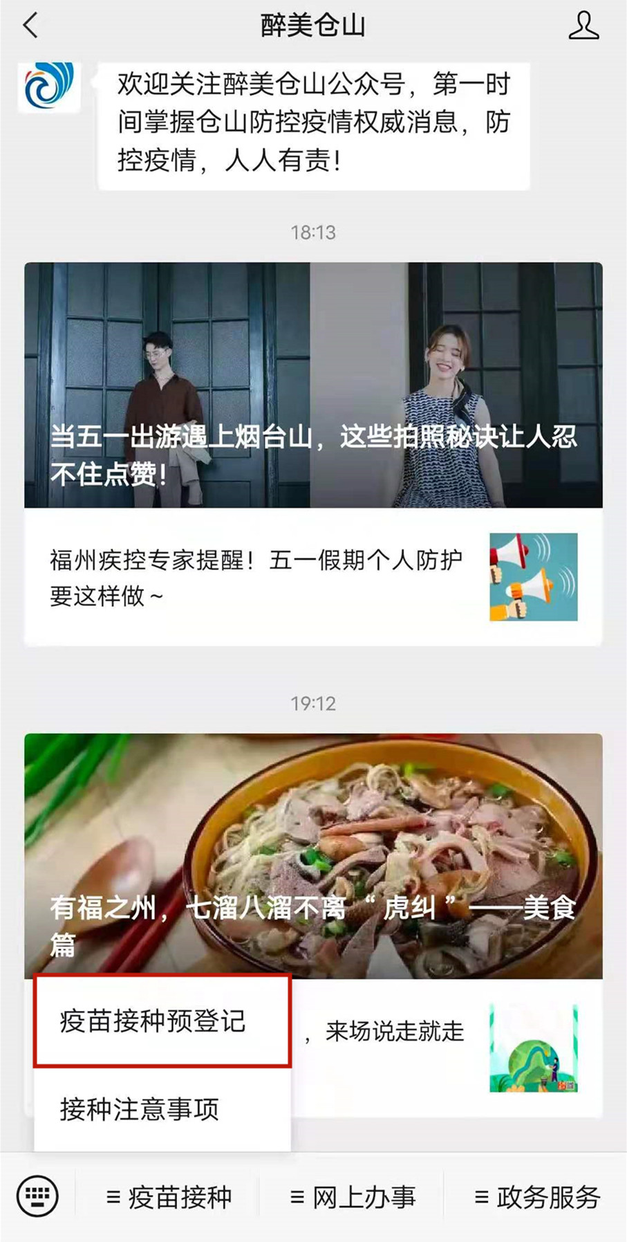 關(guān)注并進入“醉美倉山”公眾號后,點擊下方“疫苗接種”按鈕,再點擊“疫苗接種預(yù)登記”。