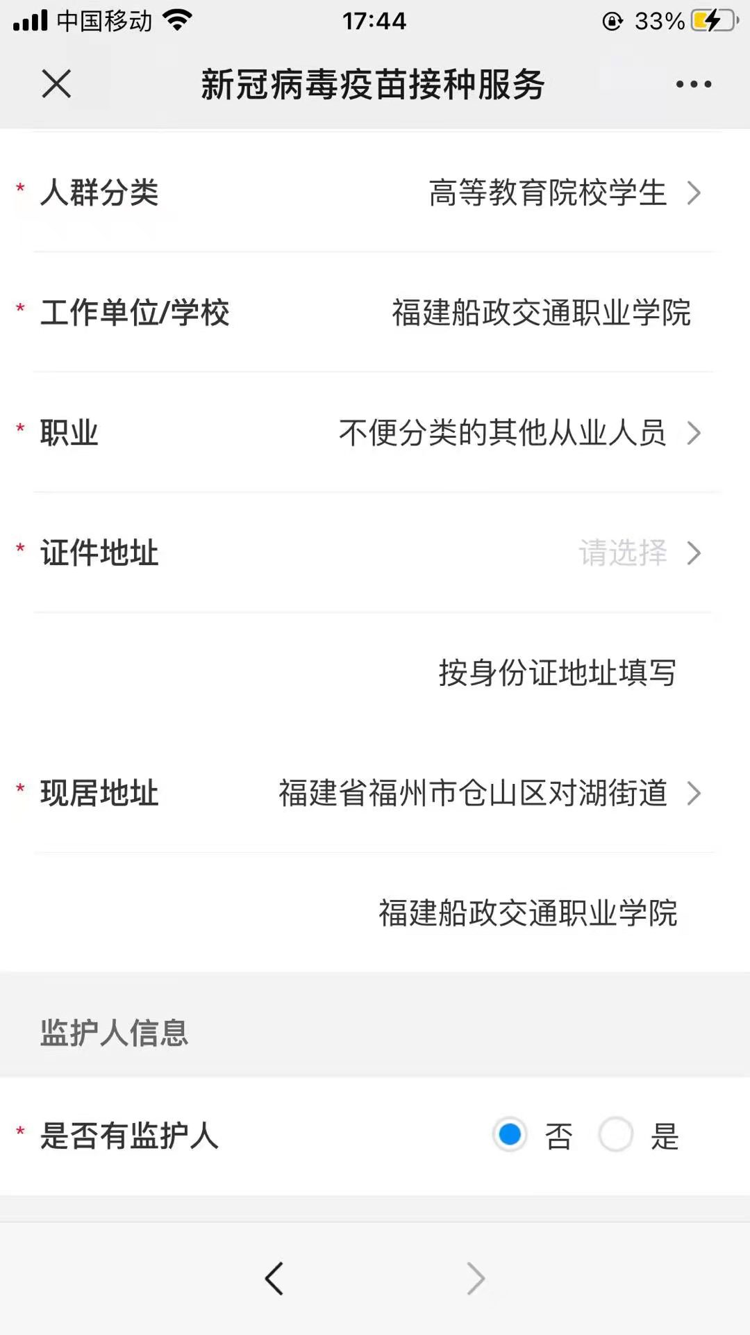 進入信息收集頁面后,請依照自己的個人信息準(zhǔn)確填寫表格。(學(xué)生預(yù)登記內(nèi)容參照以下模版,教師、醫(yī)務(wù)人員請對應(yīng)各自相關(guān)職業(yè)選擇填寫)因預(yù)登記碼7天失效,故在接種日前2~3天填寫即可。