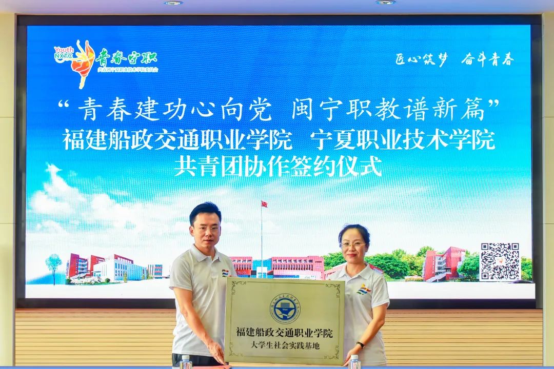 福建船政交通職業(yè)學(xué)院向?qū)幭穆殬I(yè)技術(shù)學(xué)院授大學(xué)生社會(huì)實(shí)踐基地牌。