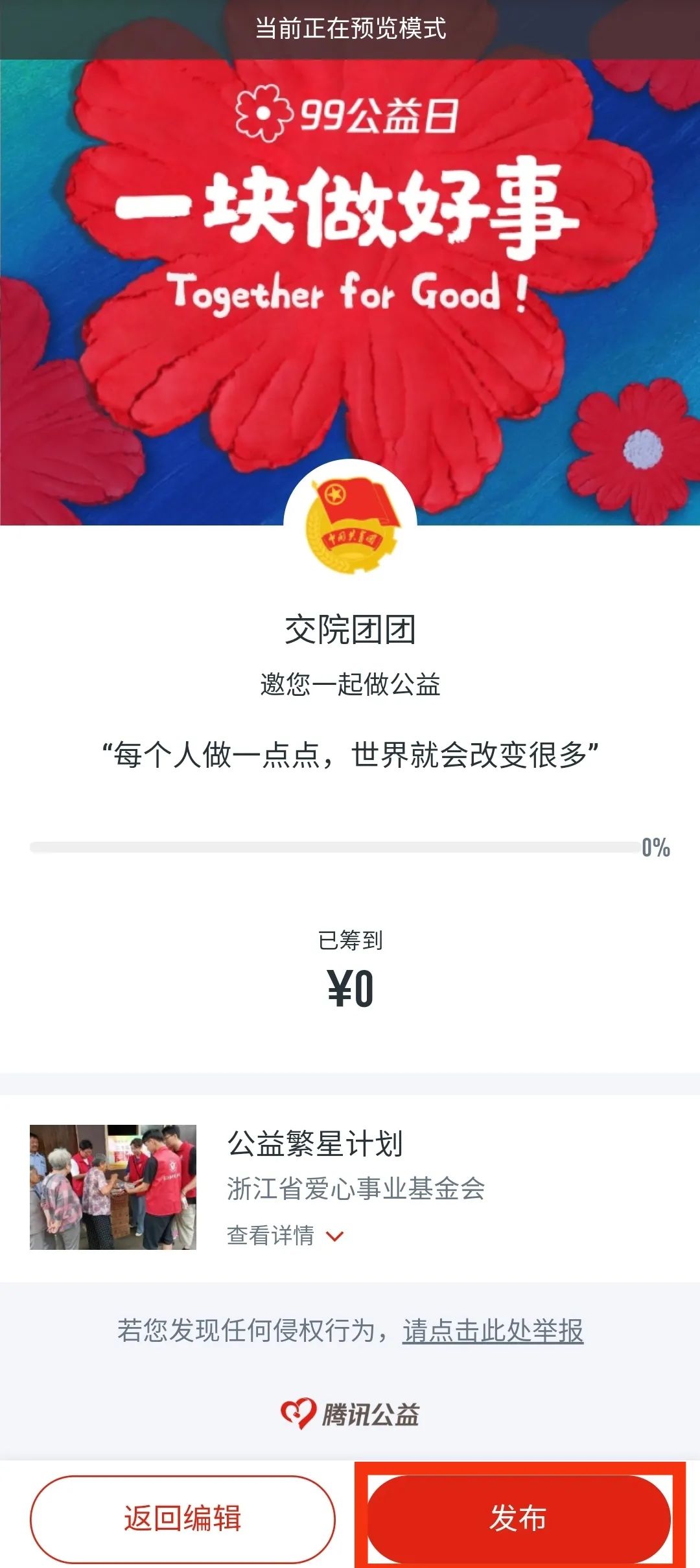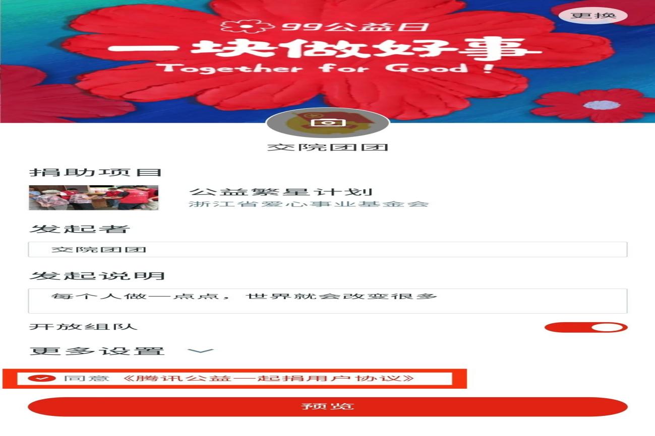第二步,填寫發(fā)起人、發(fā)起說(shuō)明等信息,勾選《騰訊公益一起捐用戶協(xié)議》后,進(jìn)入預(yù)覽界面。