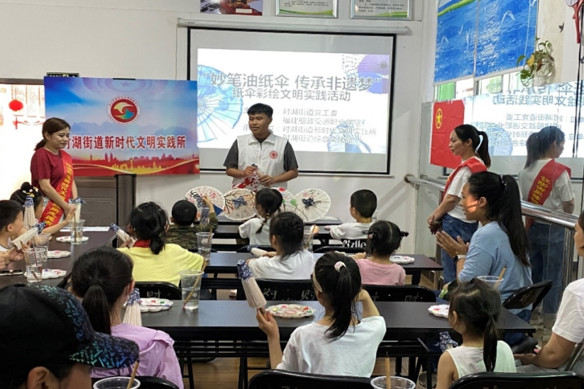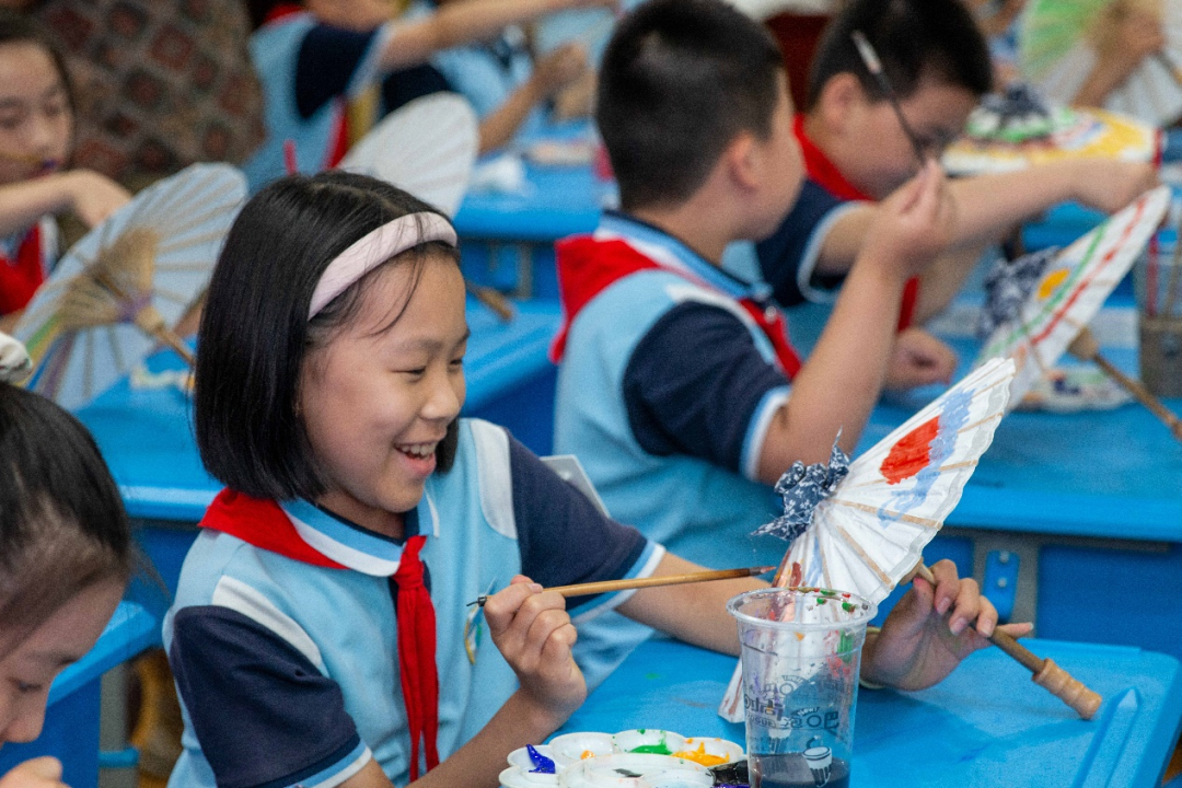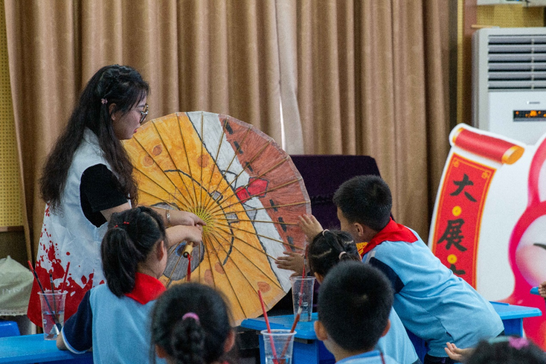在施程小學(xué),社團成員們將油紙傘帶進了課堂,讓孩子們從小接觸這一傳統(tǒng)技藝,讓他們對油紙傘產(chǎn)生興趣,從而在他們心中播下傳承非遺文化的種子。