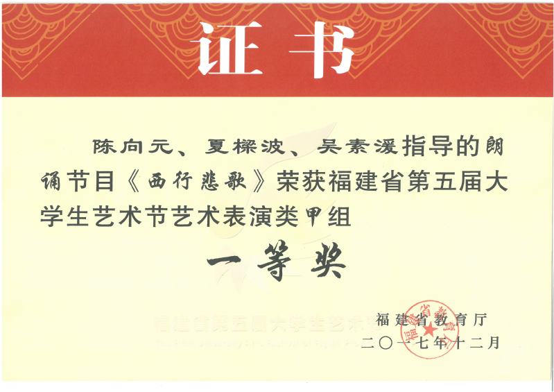 陳向元 夏樑波 吳素湲指導的的朗誦節(jié)目《西行悲歌》獲福建省第五屆大學生藝術(shù)節(jié)表演類甲組一等獎